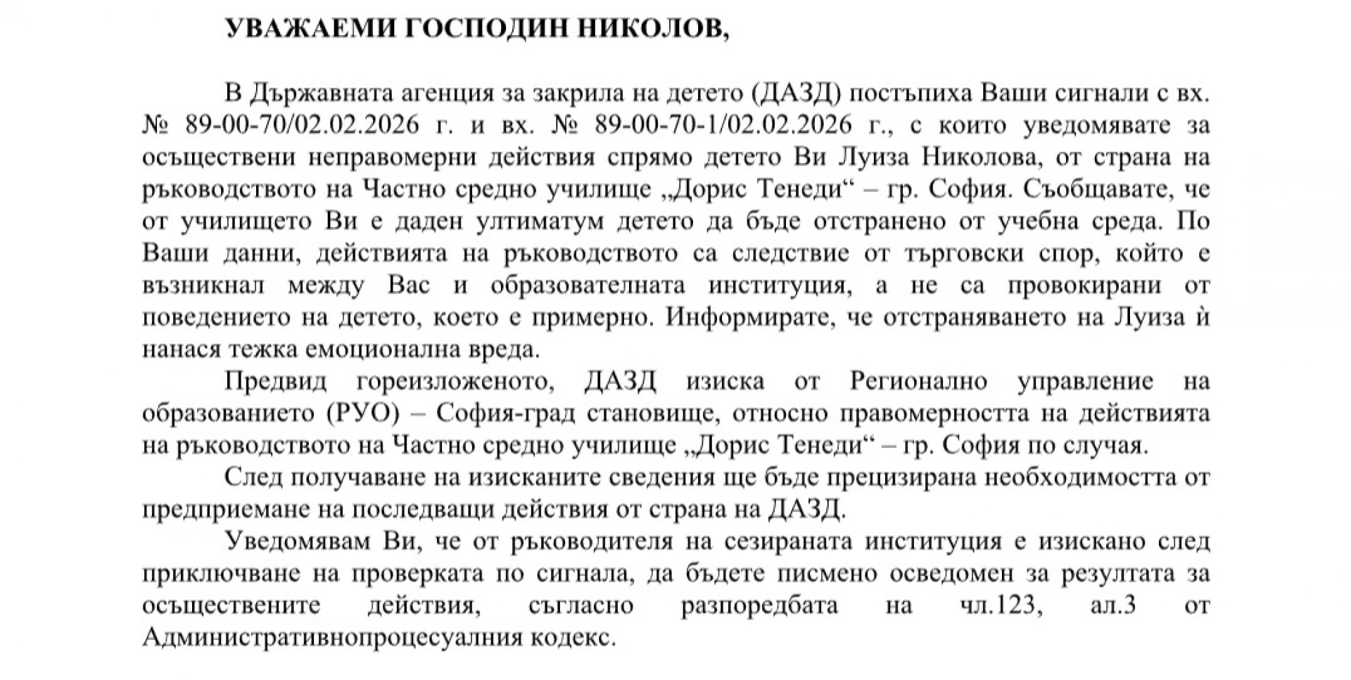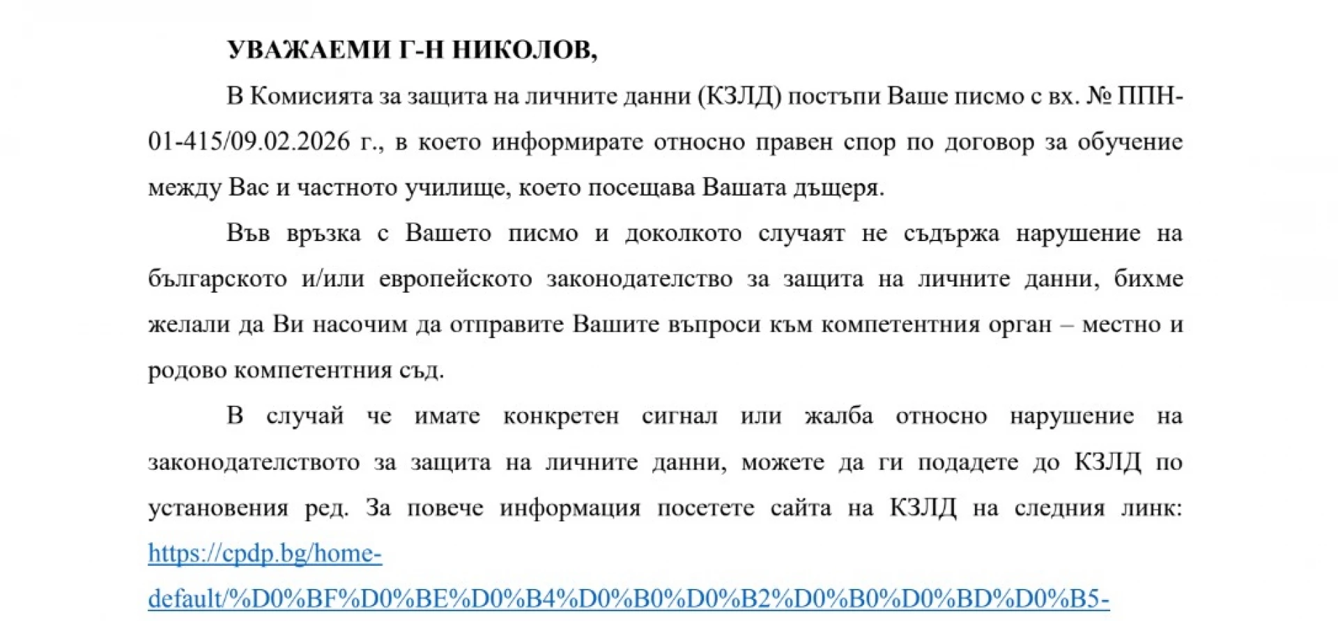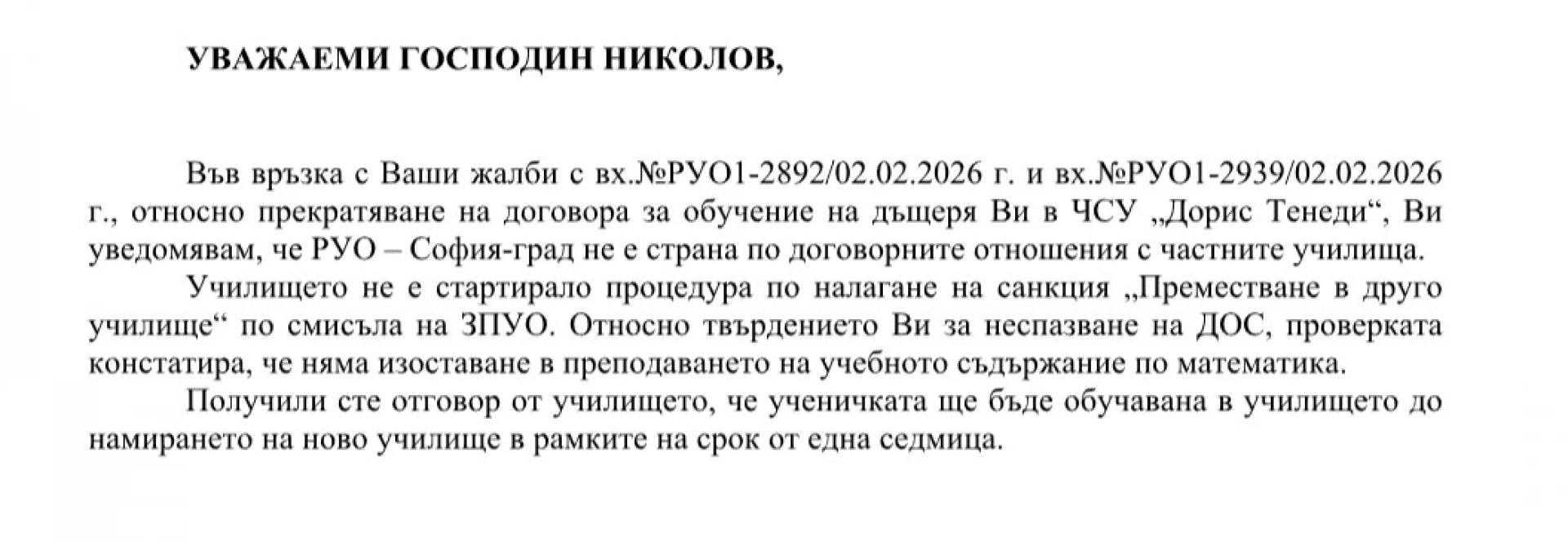 "Позовавайки се на конкретен член, алинея и точка от договора ни, училището едностранно прекрати договора, считано от 3 февруари. Съответният текст от договора предвижда възможност за едностранно прекратяване "при действия от страна на възложителя, които създават напрежение в отношенията между родителите и екипа на училището и рефлектират върху неговия авторитет и добро име", пояснява майката.