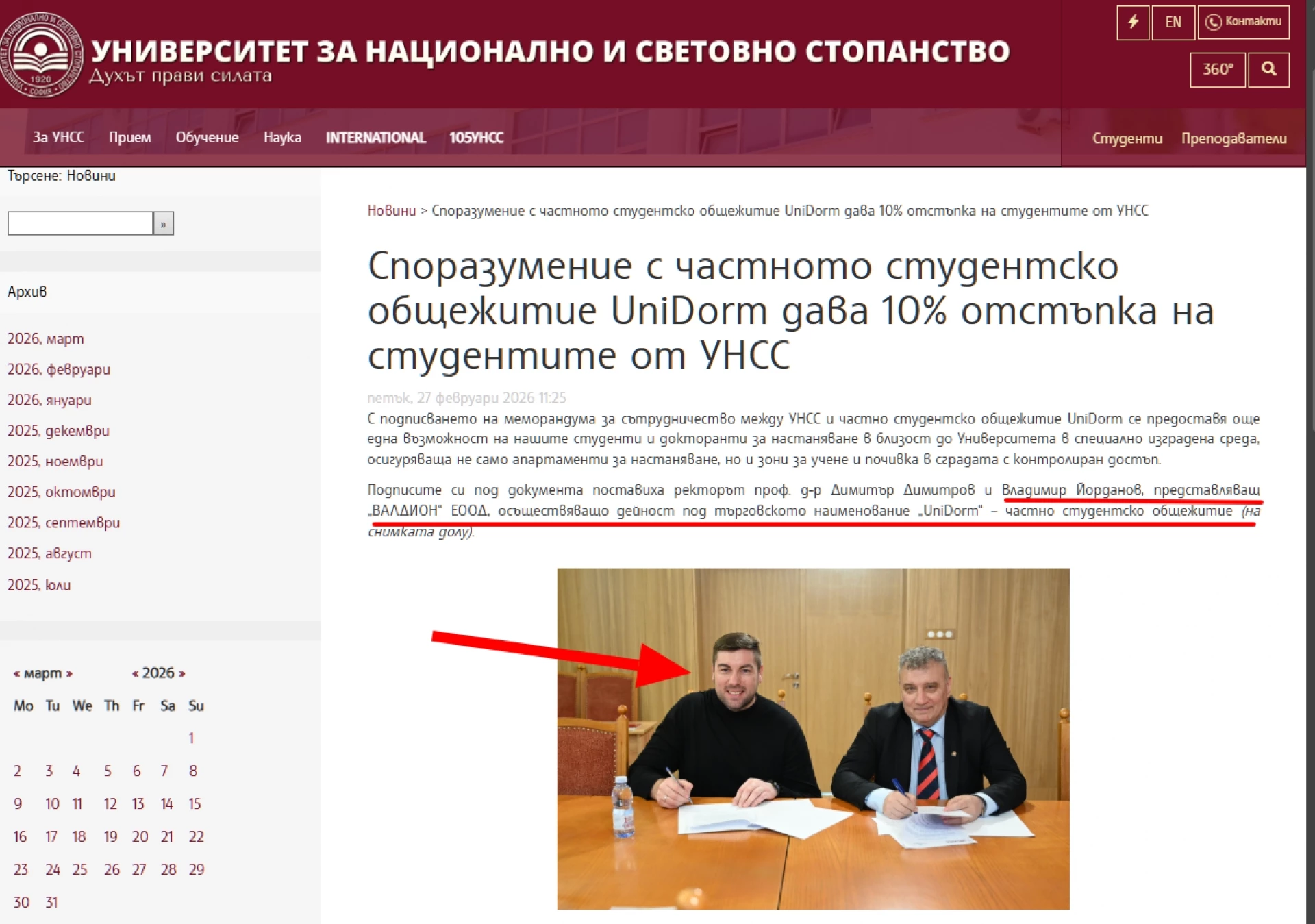 В сигнала си източниците ни съобщават, че Йорданов е сключил меморандум с Университета за национално и световно стопанство (УНСС), който също е солиден бенефициер по програмите на ЦРЧР, от името на частна фирма, посочен като неин представляващ. В статия, публикувана в сайта на университета на 27 февруари 2026 г., е уточнено, че ректорът проф. д-р Димитър Димитров и Владимир Йорданов са договорили 10% отстъпка за студентите на УНСС от цената на ползване на частното общежитие на Йорданов.