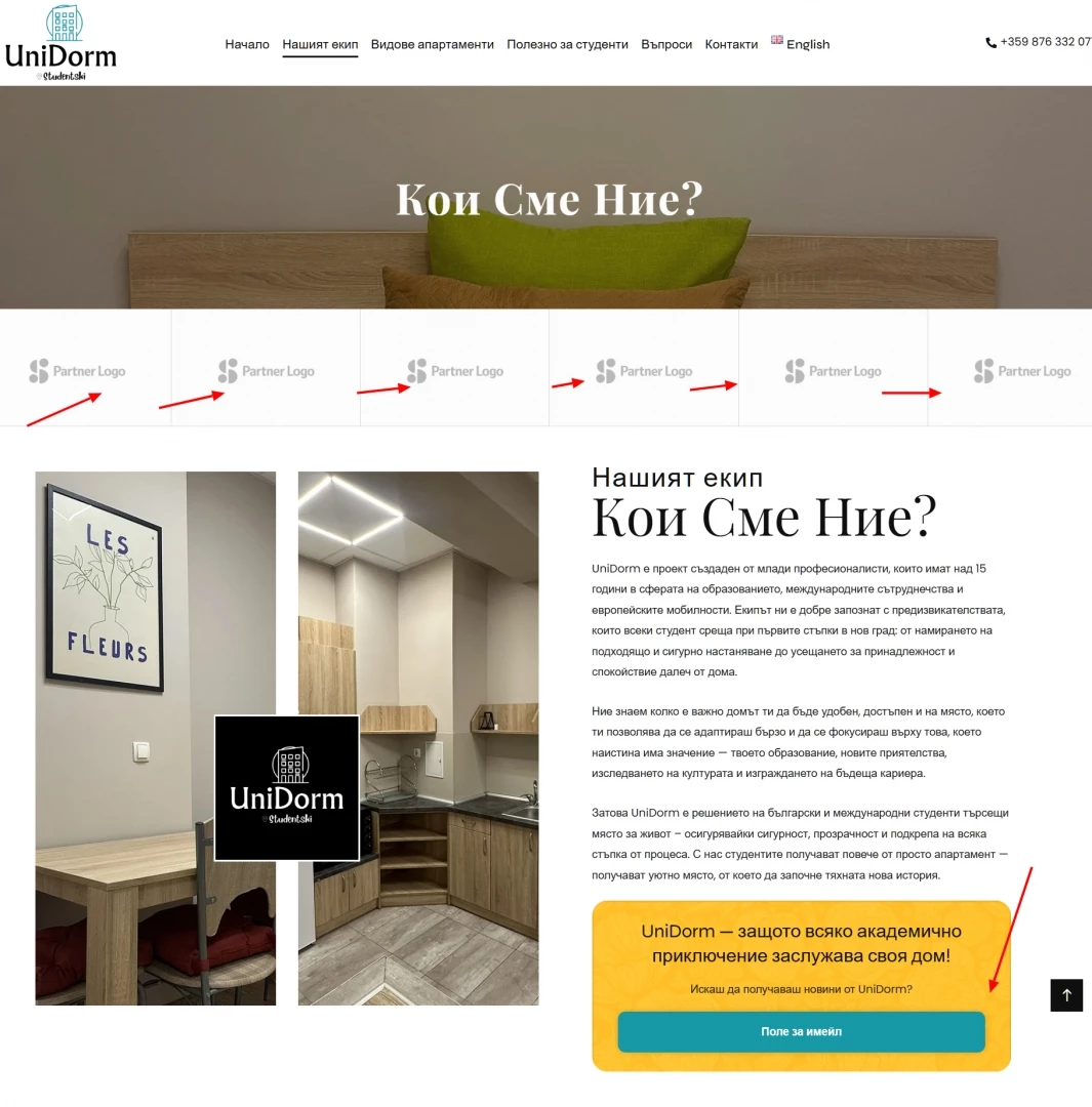 При опита ни да открием кои са членове на екипа на "UniDorm" откриваме неразработена страница в сайта - липсващи логота, полета за контакт и имейл, както и снимки или имена.