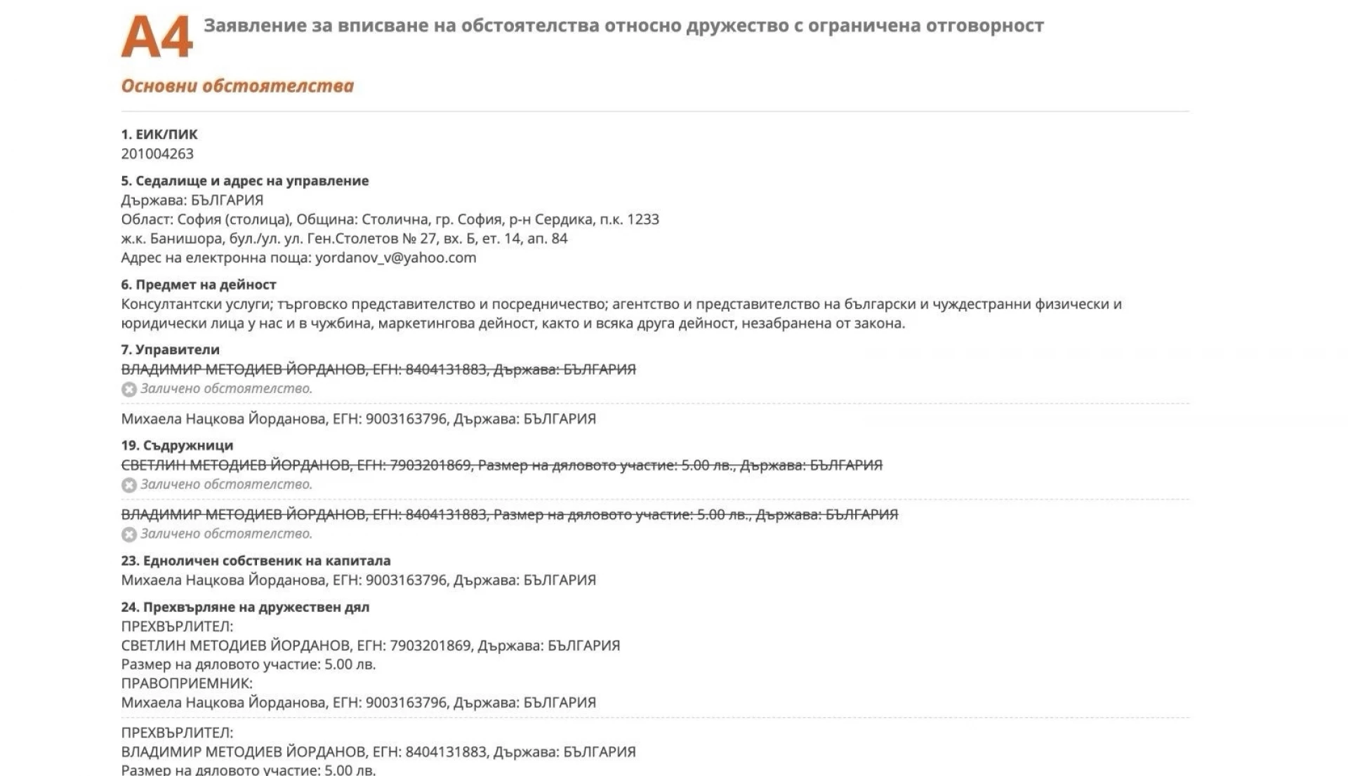 По данни на източниците на Actualno.com се оказва, че Владимир Йорданов всъщност е прехвърлил дяловете си от "ВАЛДИОН" ЕООД на Михаела Йорданова, тъй като позицията която заема, е абсолютно несъвместима по закон с всякакво участие във фирми и търговска дейност. Данните са публично видими и в Търговския регистър.