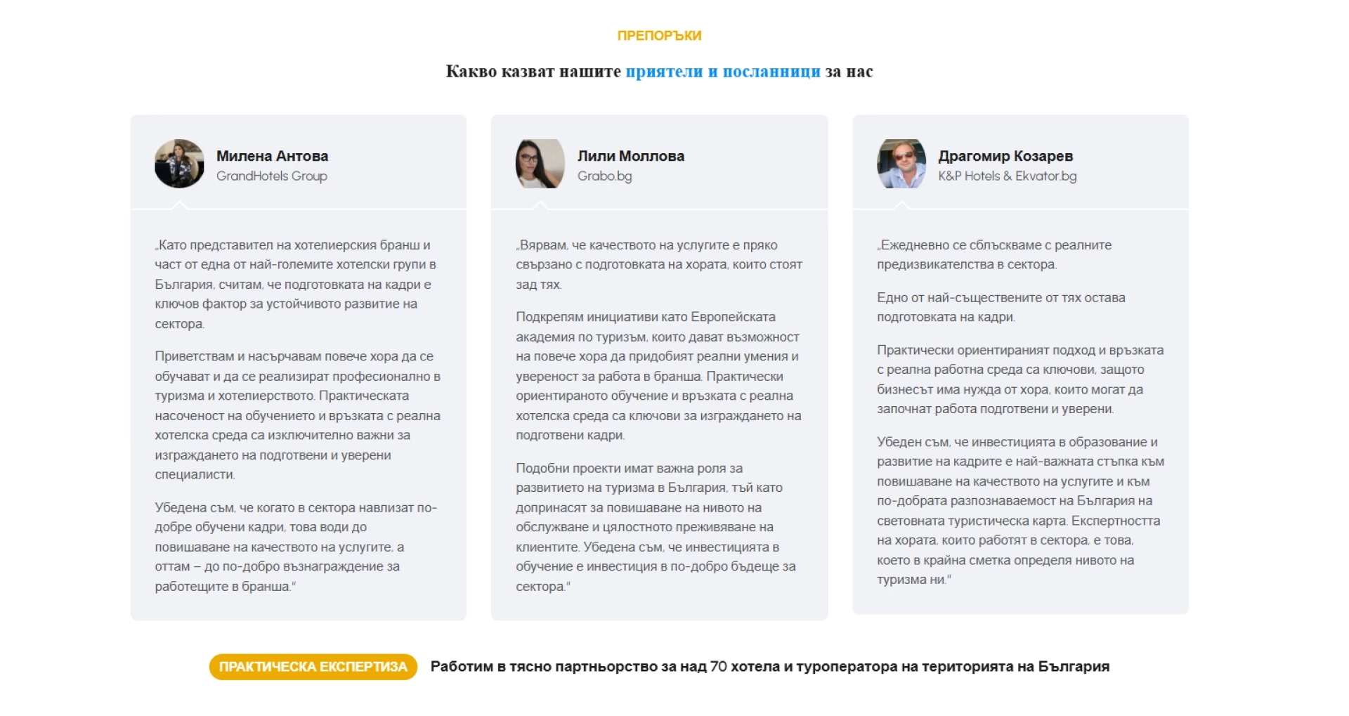 Програмите са насочени към реалните нужди на бизнеса и обхващат ключови позиции в хотелиерството:
