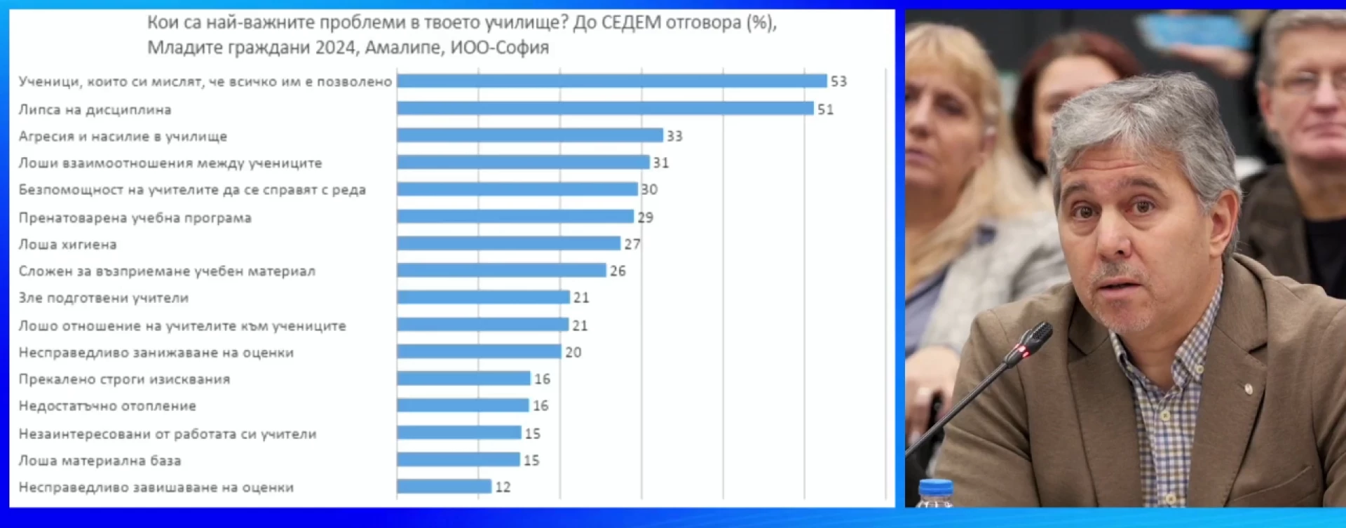 "53% от участващите в проучването "Младите граждани 2024" на "Амалипе" и Института споделят, че основния проблем са ученици, които си мислят, че всичко им е позволено, следвани от 51%, споделящи липсата на диспицплина като основен проблем. По-назад остават проявите на агресия и насилие в училище (33%), лоши взаимотношения между учениците (31%), безпомощността на учителите да се справят с реда (30%) и т.н.", обяви Илко Йорданов от "Отворено общество".