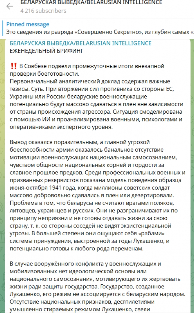Ситуацията е била моделирана с помощта на изкуствен интелект и е анализирана от военни, психолози и оперативни експерти. Оказва се, че основната заплаха за бойната готовност на беларуската армия е липсата на мотивация.