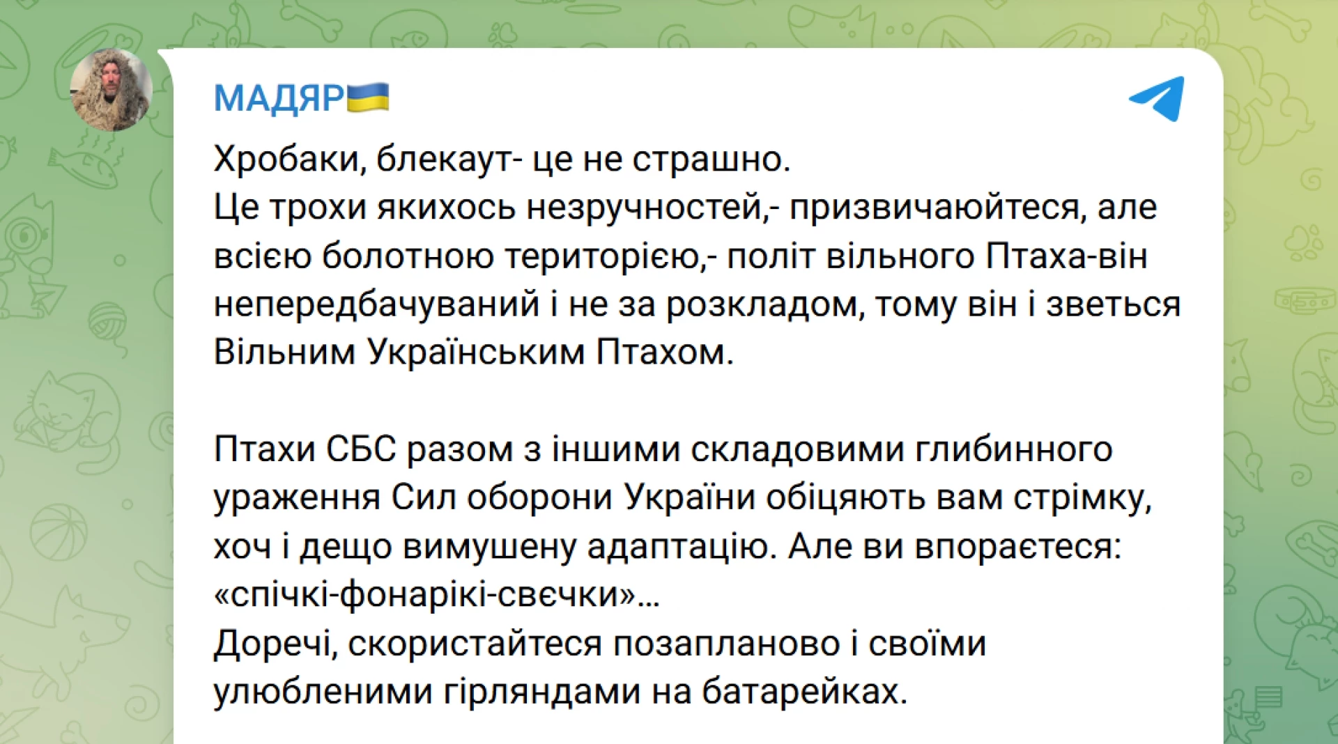 "Червеи, спирането на тока не е чак толкова страшна работа." С тези думи се обърна към руснаците украинският военен от унгарски произход Роберт Бровди с позивна "Мадяр," който е командир на Силите за безпилотни системи на украинската армия (неговото подразделение "Птиците на Мадяр" бе разширено и преобразувано от рота на отделна бригада 414). В канала си в Telegram в събота, 1 ноември, Мадяр написа: "Това е малко неудобство, свиквайте. По цялата територия на блатата полетът на свободната птица (дрона - бел.ред.) е непредсказуем и не е по разписание, точно затова се нарича Свободна украинска птица."