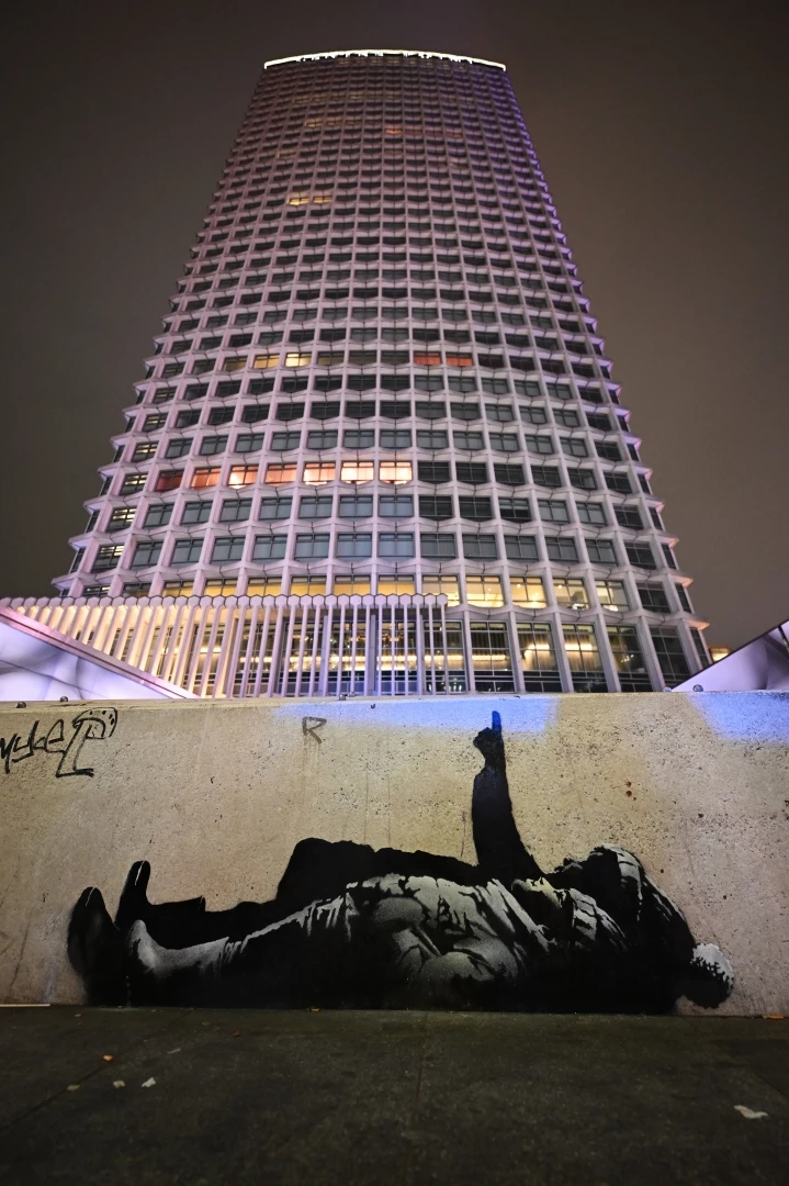 Черно-белият графит, изрисуван над гараж, изобразява две фигури, облечени в зимни шапки и ботуши, лежащи на земята, като едната от тях сочи с пръст нагоре. Идентична картина се появи и в подножието на кула в центъра на Лондон, но графити художникът не публикува тази версия в профила си, съобщава "Асошиейтед прес".