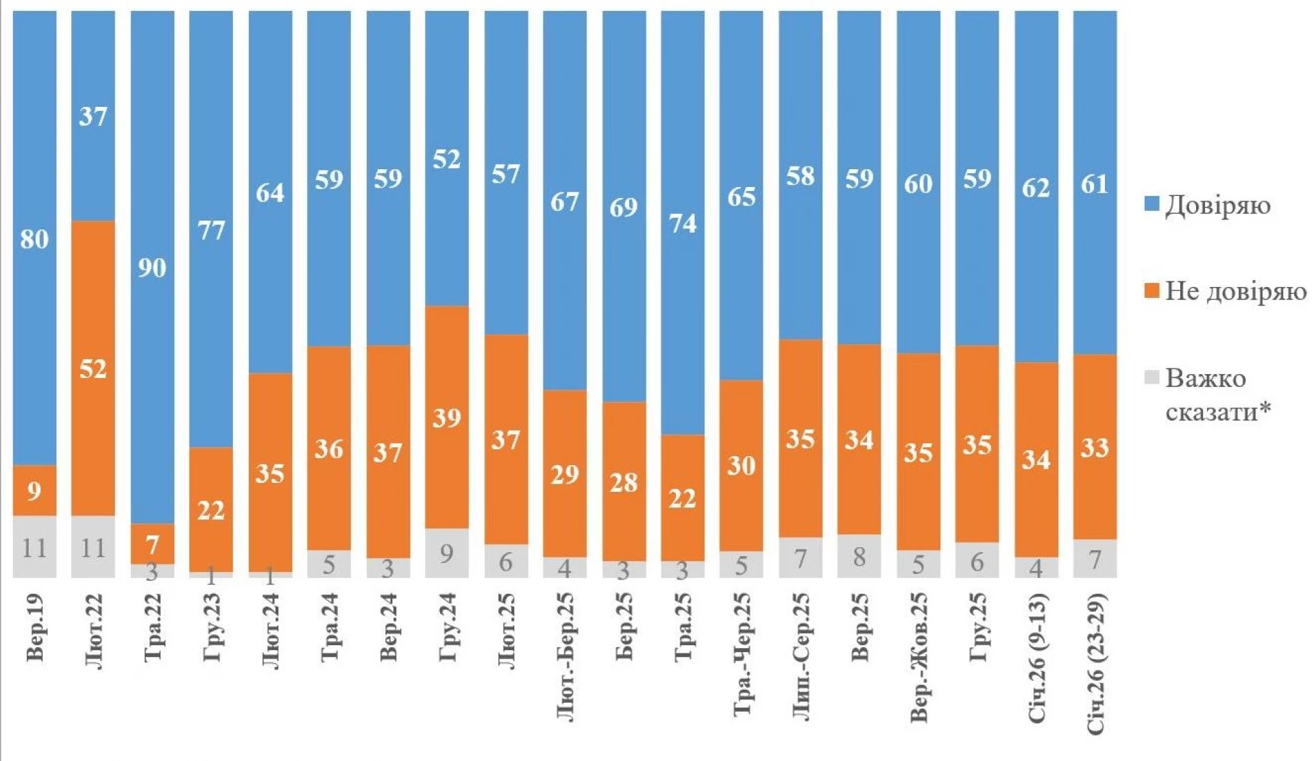 Доверието към президента Володимир Зеленски в Украйна остава непроменено - мнозинството украинци (61%) продължават да имат доверие на държавния глава, не му се доверяват – 33%. Това са резултати от последното допитване, проведено от Киевския международен институт по социология (КИИС), които показват, че промяна в сравнение с предишното изследване няма.