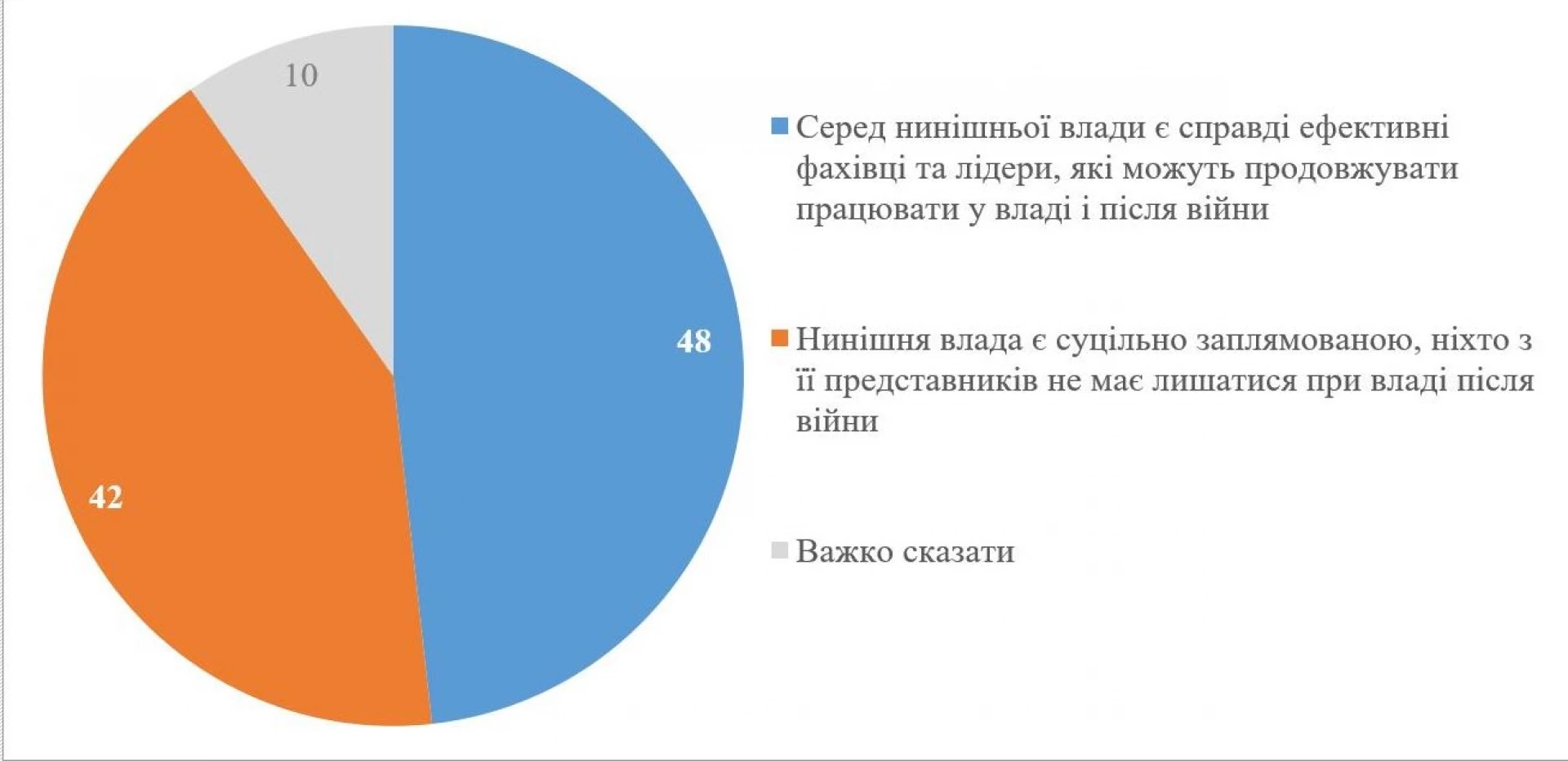 Друг въпрос в изследването е искат ли украинците ново правителство предвид резултатите от предишното изследване от декември 2025 г., които показаха, че по-голямата част от населението в Украйна е недоволно от действията на правителството и парламента (през декември само 12% са отговорили, че се доверяват на Върховната рада и само 23% на правителството). Въпреки недоволството, резултатите сочат, че половината от анкетираните (48%) смятат, че сред настоящото правителство има истински професионалисти и че те могат да останат на власт и след войната. В същото време 42% смятат настоящото правителство за напълно опетнено и твърдят, че никой от неговите представители не трябва да остане на власт след войната.