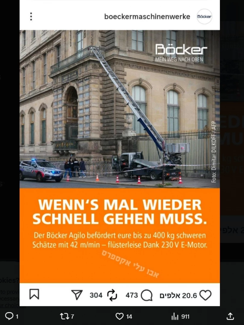 Подемникът, използван от крадците, които преди дни изнесоха безценни бижута от Лувъра при дръзкия си обир, е произведен от немска компания. Собствениците на компанията, научавайки новината, не загубиха самообладание и с находчивост и хумор успяха да извлекат от нея максималното, превръщайки инцидента в мощен рекламен трик.