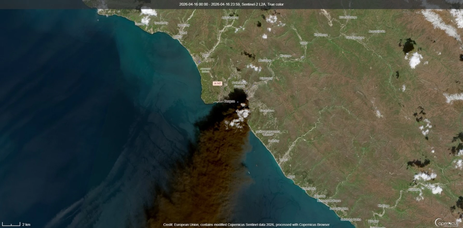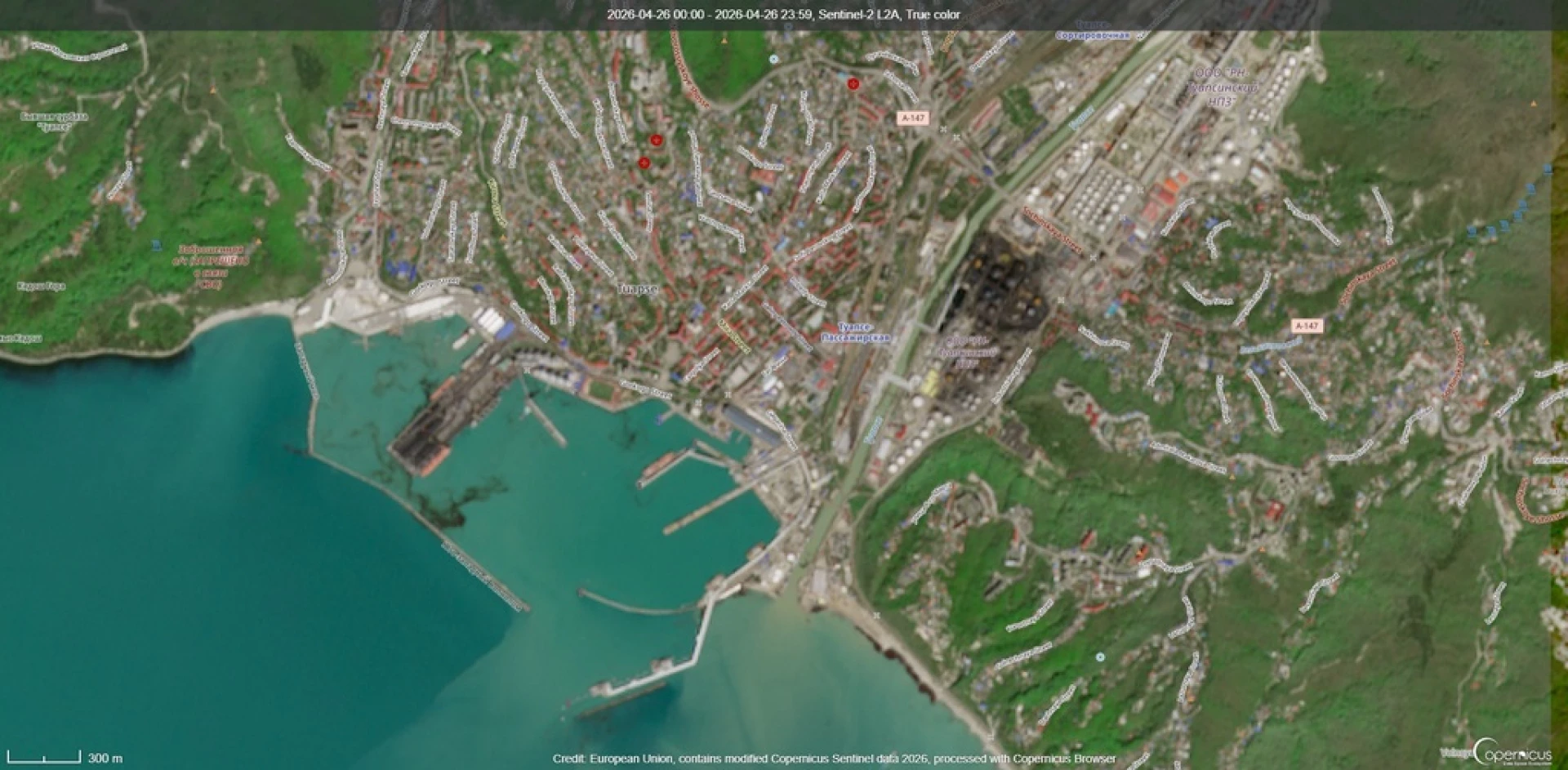 СНИМКИ: Дигитален атлас - изображения от програма "Коперник", Sentinel-2. Снимка 1 е от 16.04.26 - показва непосредствените последници от първия украински удар с далекобойни дронове по рафинерията в Туапсе, снимки 2 и 3 са от 26.04.26 и показват последиците, след като имаше украински удар и на 20 април.