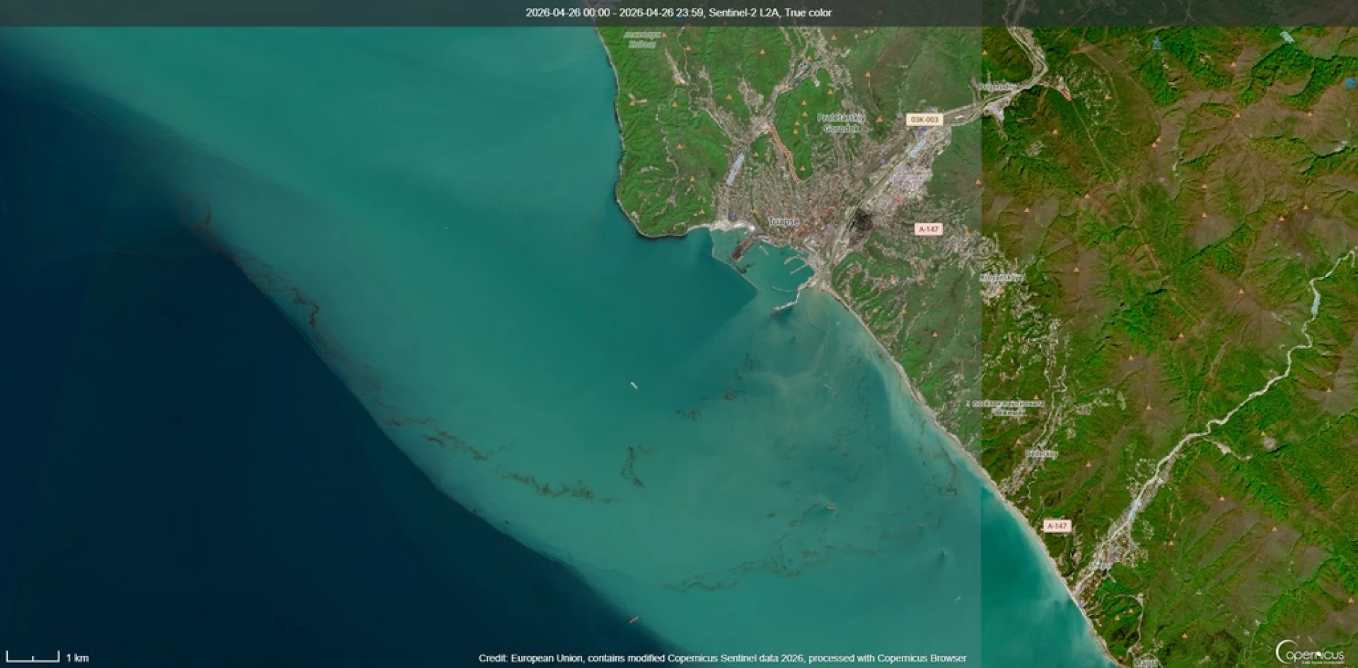 Колко лошо е положението личи от сателитни снимки - петролни петна и то огромни вече личат в Черно море. Големината - един пиксел от тъмните ивици е равен на 10 метра, а става въпрос за стотици пиксели. Накъде ще отиде всичката тази мръсотия - предстои да видим - Още: Петролен дъжд, отровен въздух - няма проблем за туризма в Туапсе, твърди Руският туристически съюз (ВИДЕО)