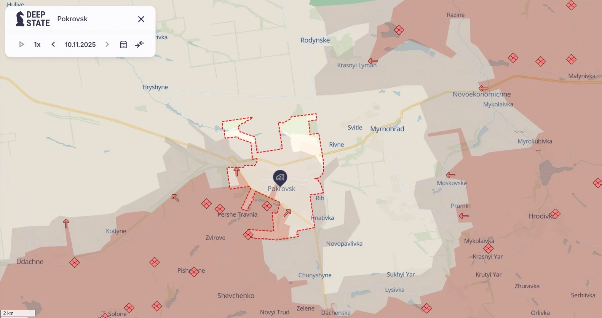 Темпото на руското настъпление в посока Покровск остава относително бавно, вероятно защото руското военно командване продължава да провежда изтощителни настъпателни операции в целия театър на военните действия, анализира американският мозъчен тръст Институт за изучаване на войната (ISW). Оценката на експертите остава непроменена - те наблюдават сравнително малко геолокализирани кадри от руското настъпление в и около Покровск в началото на ноември в сравнение с потвърденото настъпление в средата и края на октомври. Геолокализирани кадри, публикувани на 10 и 11 ноември, показват, че руските сили са напреднали в югоизточната част на Покровск, а и незначително в югоизточната част на Мирноград (източно от Покровск). Има например видео от изоставени руски мотоциклети южно от Покровск.