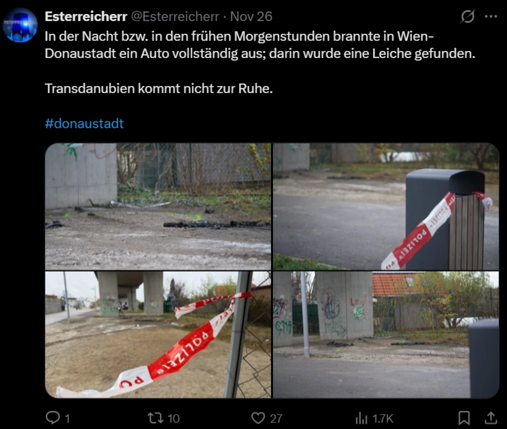 В сряда вечерта, в 00:30 ч., в квартал Донаущат във Виена минувачи откриват горяща кола и сигнализират спешните служби. Тялото на загиналия в Мерцедеса е на 21-годишен украински гражданин, показва аутопсията, проведена незабавно по разпореждане на австрийските правоохранителни органи. Следите сочат, че мъжът е бил убит жестоко, преди колата да бъде подпалена, съобщава Krone.at.