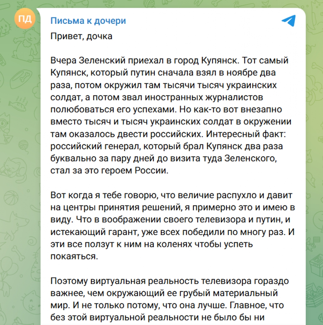 Така във въображението си и в това на телевизора Путин вече много пъти е побеждавал всички, и всички пълзят на колене пред него. Това пише рускоезичният канал в Telegram "Письма к дочери".