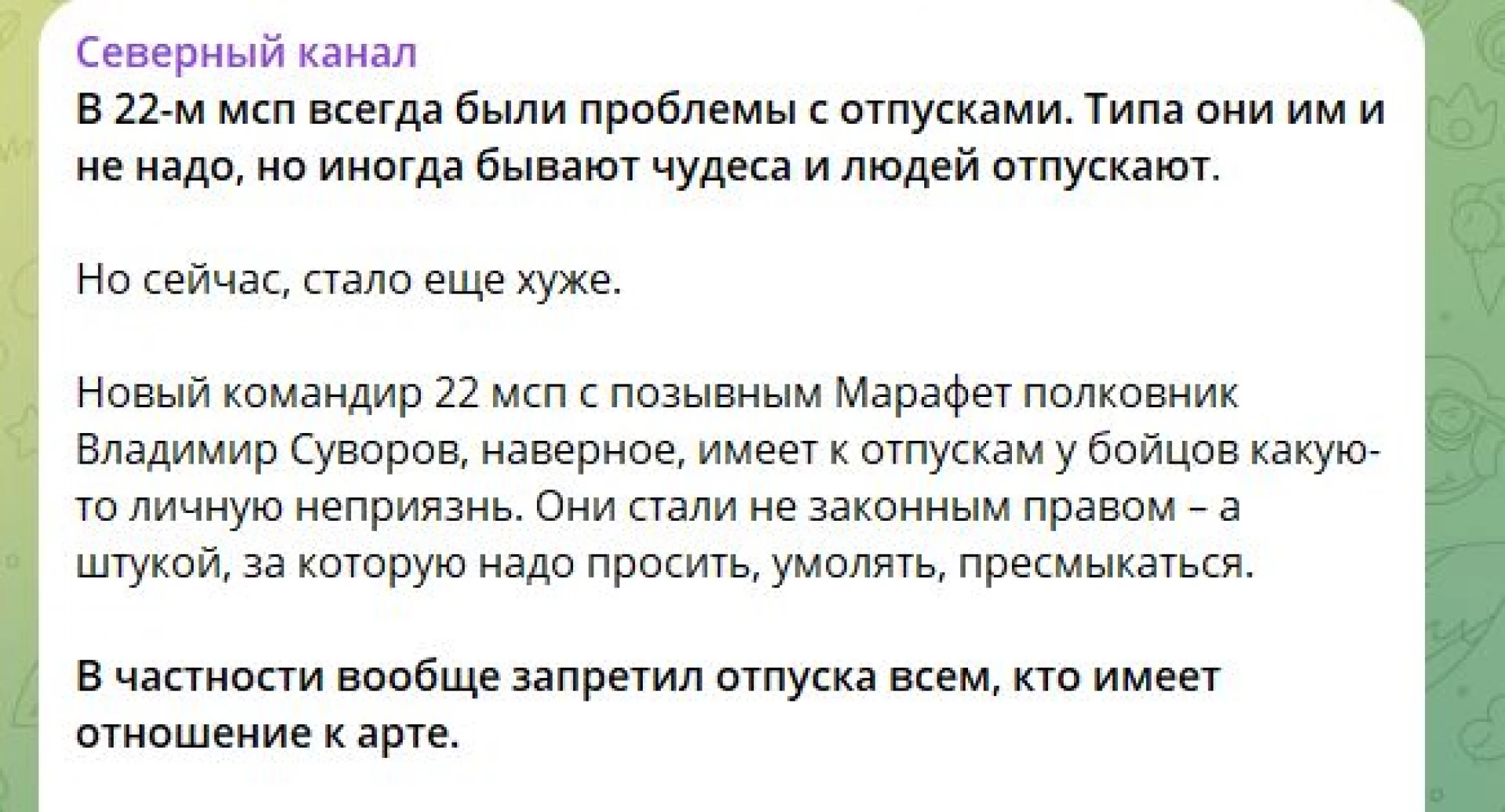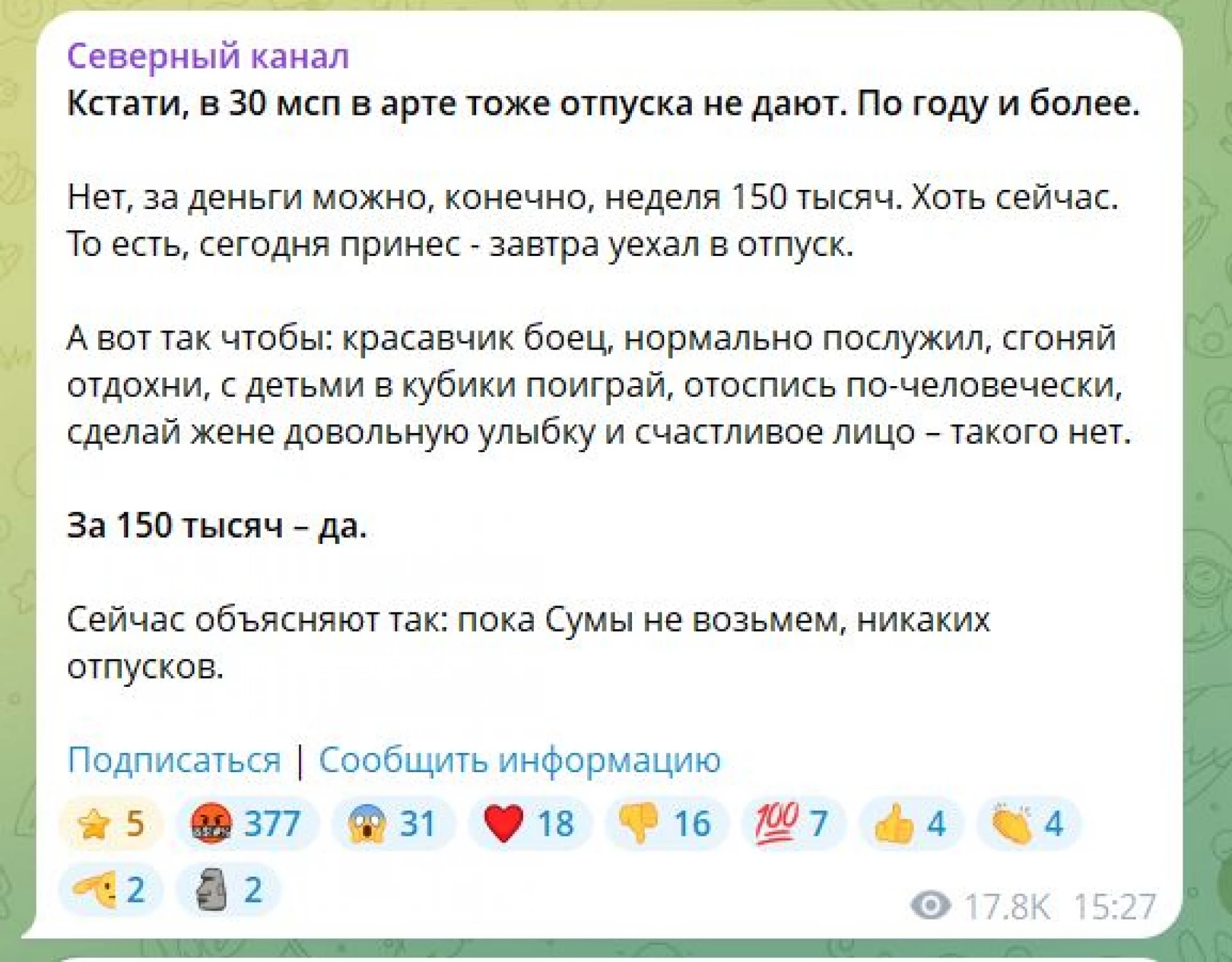 По думите на блогъра, руското командване отказва отпуски и на артилеристи от 30-ти мотострелков полк, освен ако войниците не си платят подкуп от 150 000 рубли (1838 долара) за седмица отпуск".
