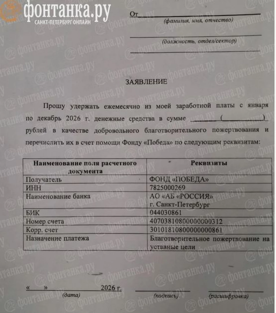 "Моля да удържате ежемесечно от моята работна заплата от януари до декември 2026 г. сумата от ............. рубли като доброволно дарение и да я превеждате на фондация "Победа"", гласи текстът на заявленията, в които удобно предварително са посочени данните на фондацията и банковата й сметка.