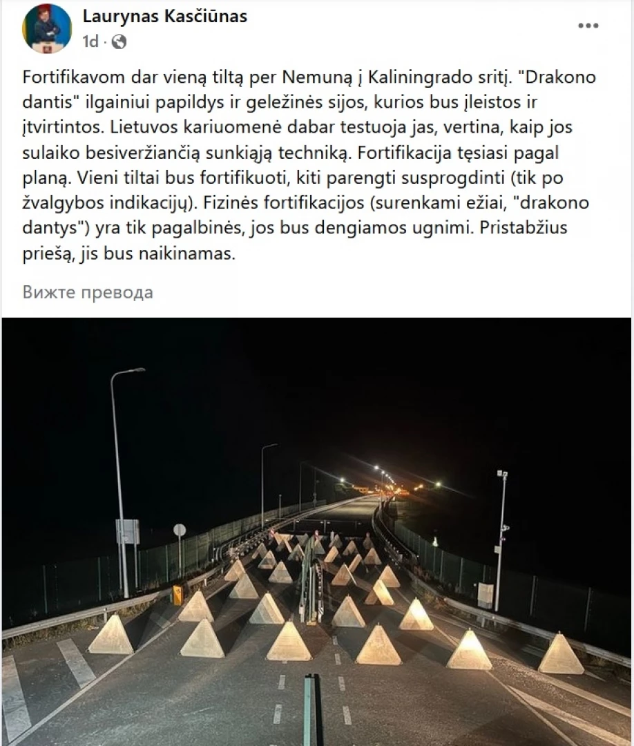 Освен това - Литва укрепва и прелези, а отделно и други препятствия, които да спират танкове: "Когато врагът се опита да преодолее всички подготвени препятствия и спре, ще го лекуваме с артилерийски и танков огън", пише в профила на Кашунас.