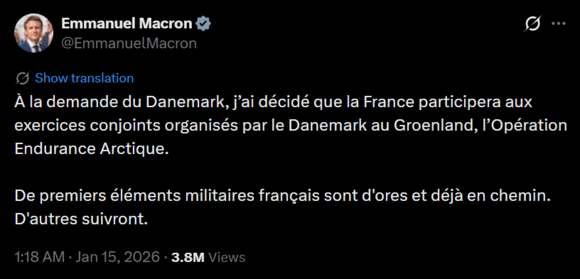 В среднощно съобщение в социалната мрежа Х Макрон заяви, че първата група френски военни вече се е отправила към Гренландия, за да участва в ученията, организирани от Дания и автономния остров.