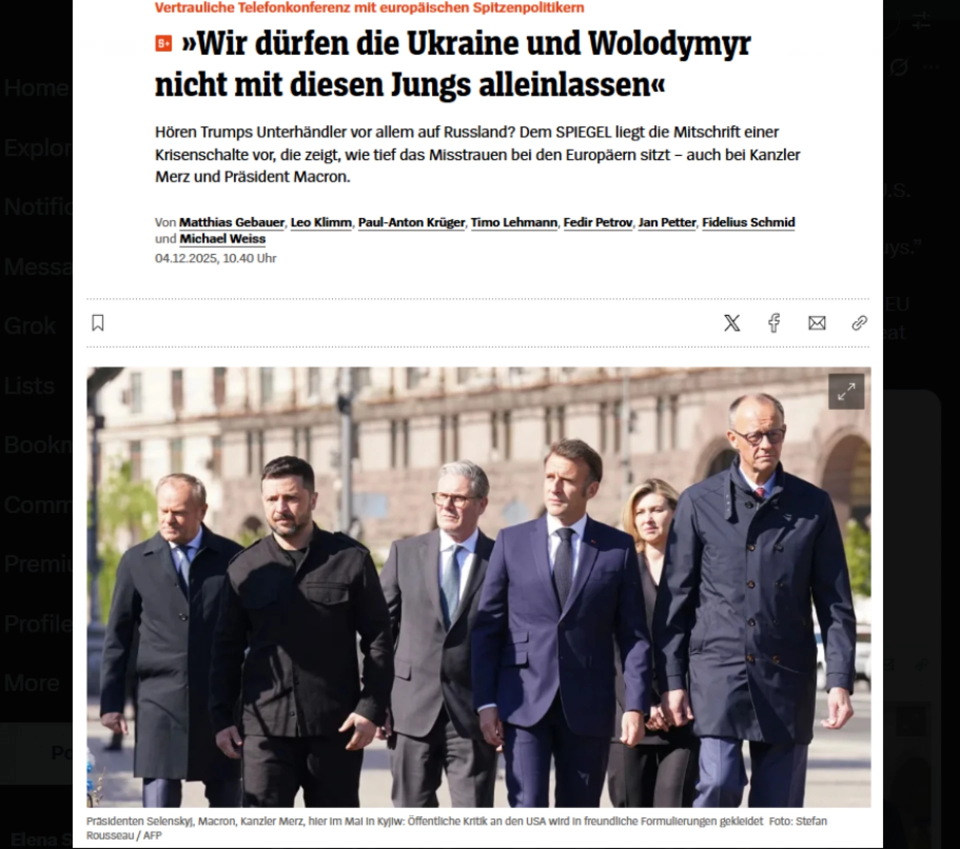 Германското издание Spiegel публикува изтекла преписка от разговори, протекли наскоро между украинския президент Володимир Зеленски и европейски лидери. Ежедневникът твърди, че се е сдобил с бележка, която съдържа различни предупреждения от ЕС до украинския държавен глава, включително реплика на германския канцлер Фридрих Мерц, който заявява, че американските преговарящи "играят игрички - и с вас, и с нас", цитира изданието The Guardian.
