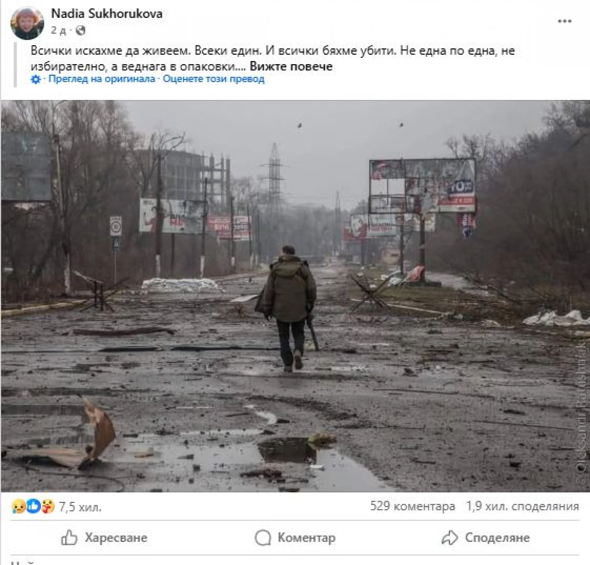 "Нямахме нищо, с което да оцеляваме. И като казвам "нищо", значи НИЩО. Нямаше хляб, нямаше вода, нямаше лекарства, нямаше светлина, нямаше нормална тоалетна, нямаше начин да се измием, да излезем навън и да се върнем живи, да заспим спокойно, да потърсим медицинска помощ, просто да се стоплим, да се обадим на семействата си, да разберем дали има някой жив в съседната къща", пише Надежда Сухорукова в профила си във Фейсбук.