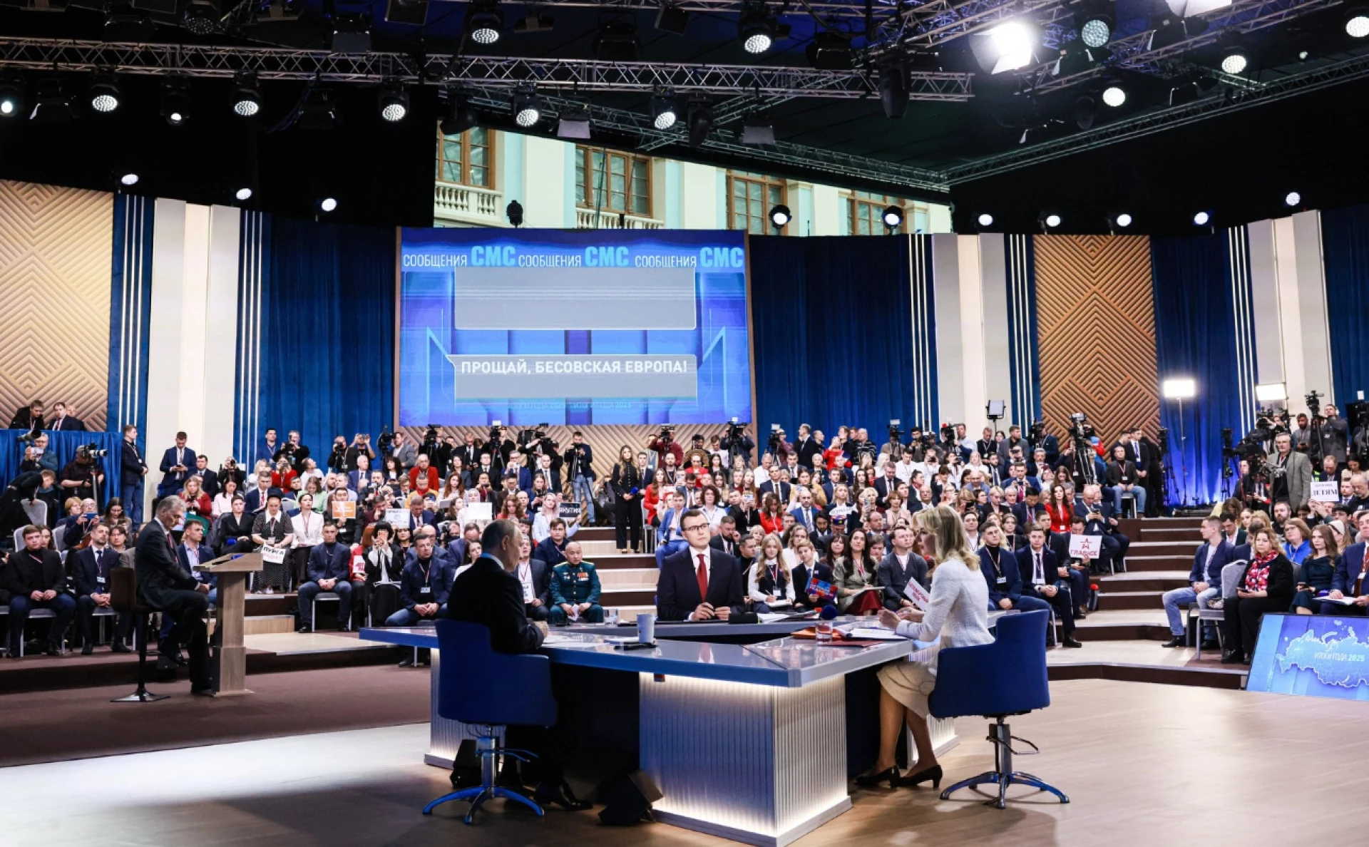 По руската държавна телевизия пък се яви детски ансамбъл от Волгоград, с червено-бели костюми, момичетата с панделки в косите. Изпълнена бе песен срещу интернет. "Не искаме интернет, няма да ни намерите онлайн. Ние не сме във вашия интернет", гласи припевът.