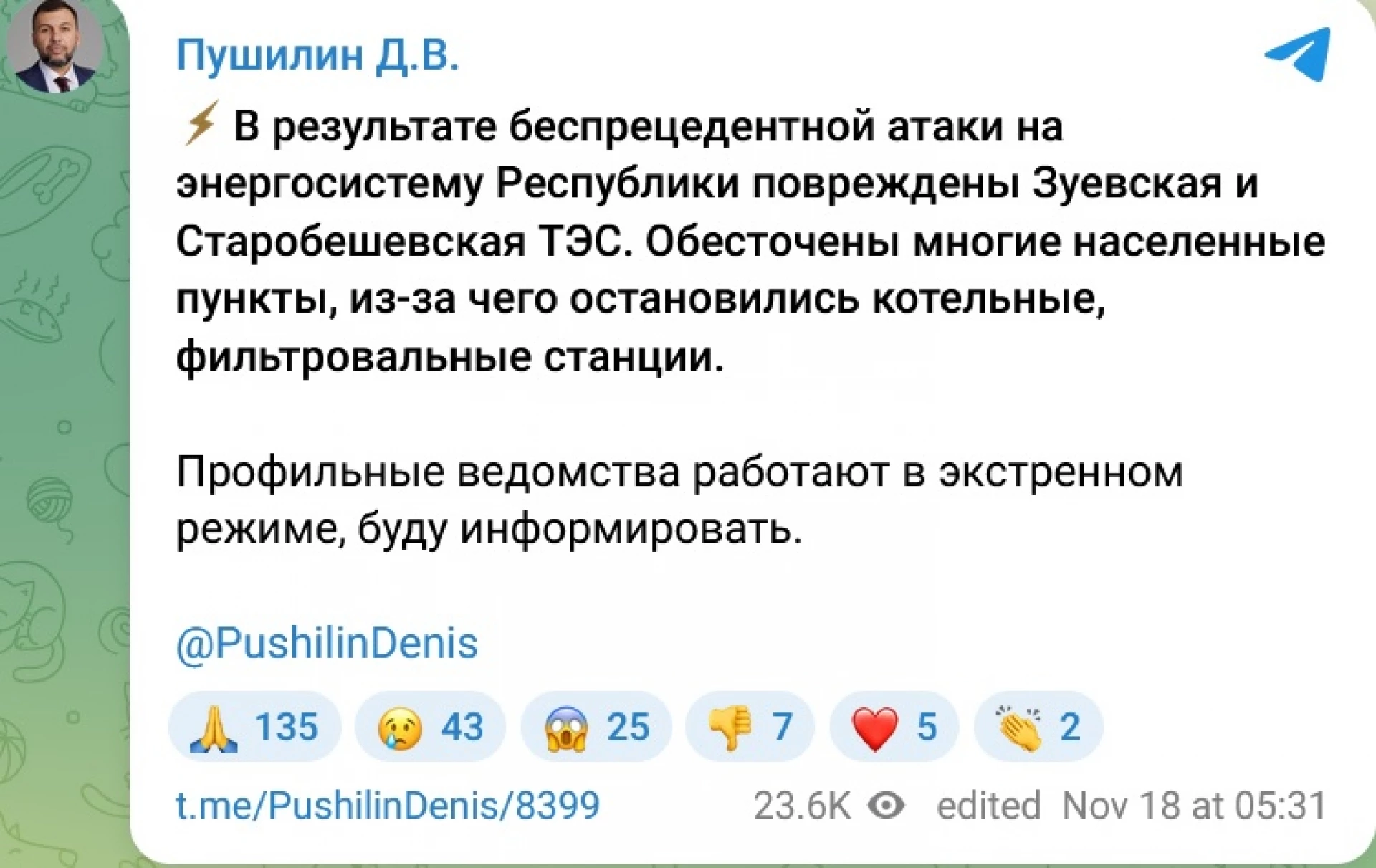"В резултат на безпрецедентна атака срещу електропреносната мрежа на републиката, ТЕЦ "Зуевская" и "Старобешеская" са повредени. Електрозахранването е прекъснато в много населени места, което е довело до спиране на котелни и филтрационни станции", гласи точното съобщение.