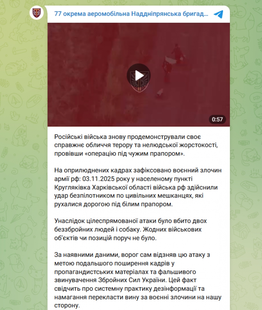 Ново доказателство за руските военни престъпления в Украйна публикува 77-ма отделна аеромобилна бригада от Въздушно-десантните войски на Украйна в телеграм канала си. Този път случаят е от село Кругляковка в Харковска област. Вчера, 3 ноември, двама цивилни - мъж и вероятно жена доколкото се вижда от кадрите, заедно с тяхното куче са били убити хладнокръвно и бездушно от руснаците, докато са вървяли по път извън селото и са носели бяло знаме. Абсолютно умишлено и с пълното съзнание, че става въпрос за невъоръжени местни жители руснаците насочват срещу тях два дрона - първият се взривява в мъжа, убивайки го на място, и се вижда ясно как кучето до него агонизира. Жената малко по встрани наблюдава в ужас какво се случва и има време само да се прекръсти преди в нея да бъде насочен друг дрон.
