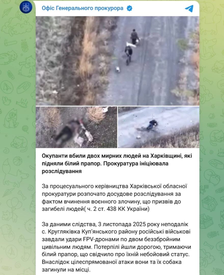 Според разследването, на 3 ноември 2025 г., близо до село Кругляковка, Купянски район, руски военнослужещи са ударили двама невъоръжени цивилни с дронове FPV. Жертвите са вървели по пътя, държейки бяло знаме, което е показвало техния невоенен статус. В резултат на целенасочената атака те и кучето им са загинали на място.