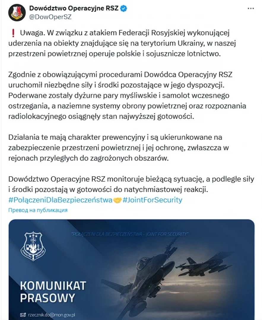 Полша вдигна съюзнически самолети в отговор на руските атаки срещу Западна Украйна. Армията съобщи за наличието на изтребители и самолет за ранно предупреждение. „Внимание. Поради атаката на Руската федерация срещу цели, разположени на украинска територия, полски и съюзнически самолети действат в нашето въздушно пространство... Във въздуха са двойки изтребители и самолет за ранно предупреждение“, съобщиха полските въоръжени сили.