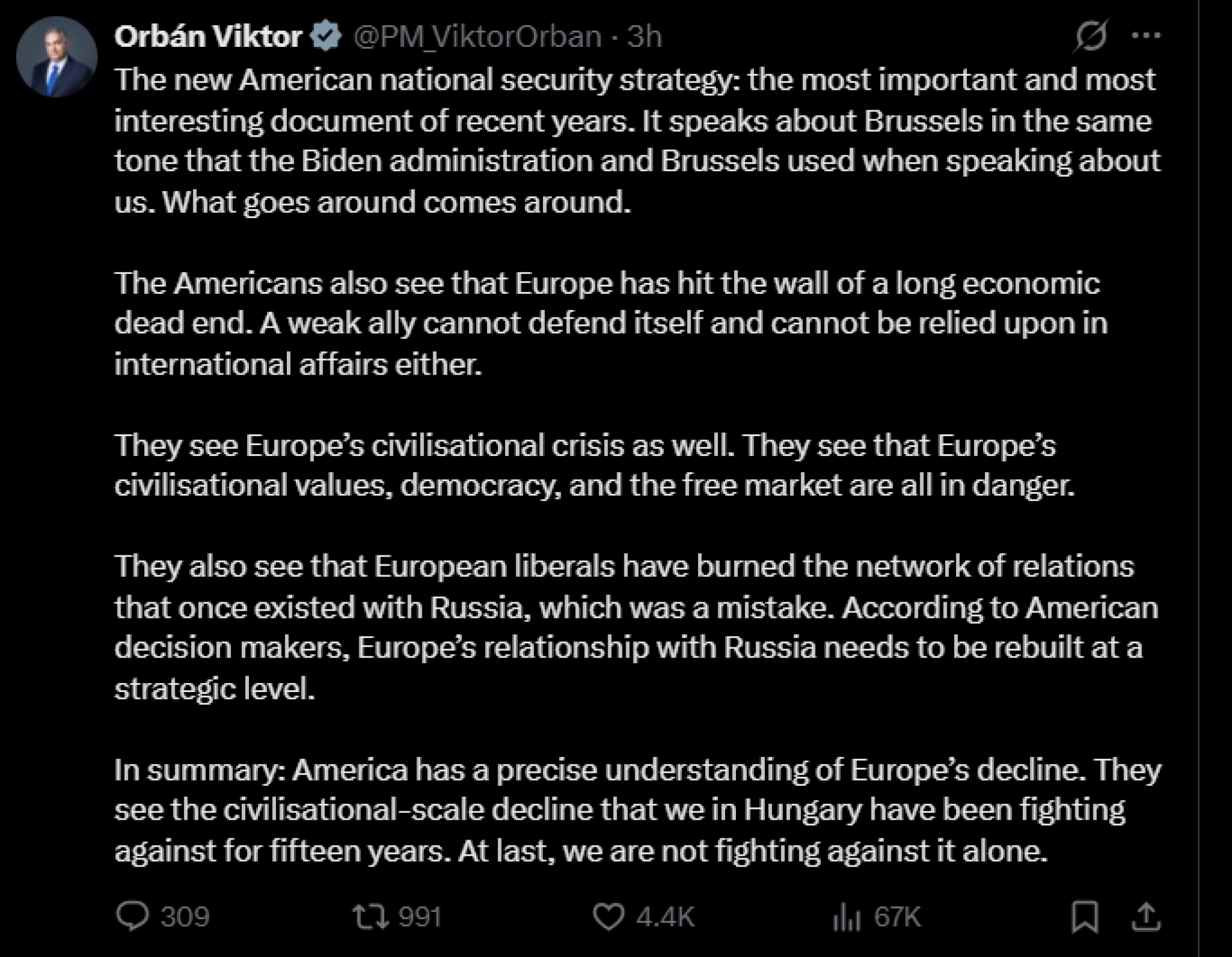 Новата стратегия за национална сигурност на администрацията на президента на САЩ Доналд Тръмп показва, че Америка осъзнава, че цялата цивилизация в Европа е в упадък и разпад. Това написа днес в платформата Х унгарският премиер Виктор Орбан. Все така прокарвайки самоотвержено политиката на руския диктатор Путин, Орбан се оплаква и, че Европа била скъсала отношенията си с Русия, което било "грешка".