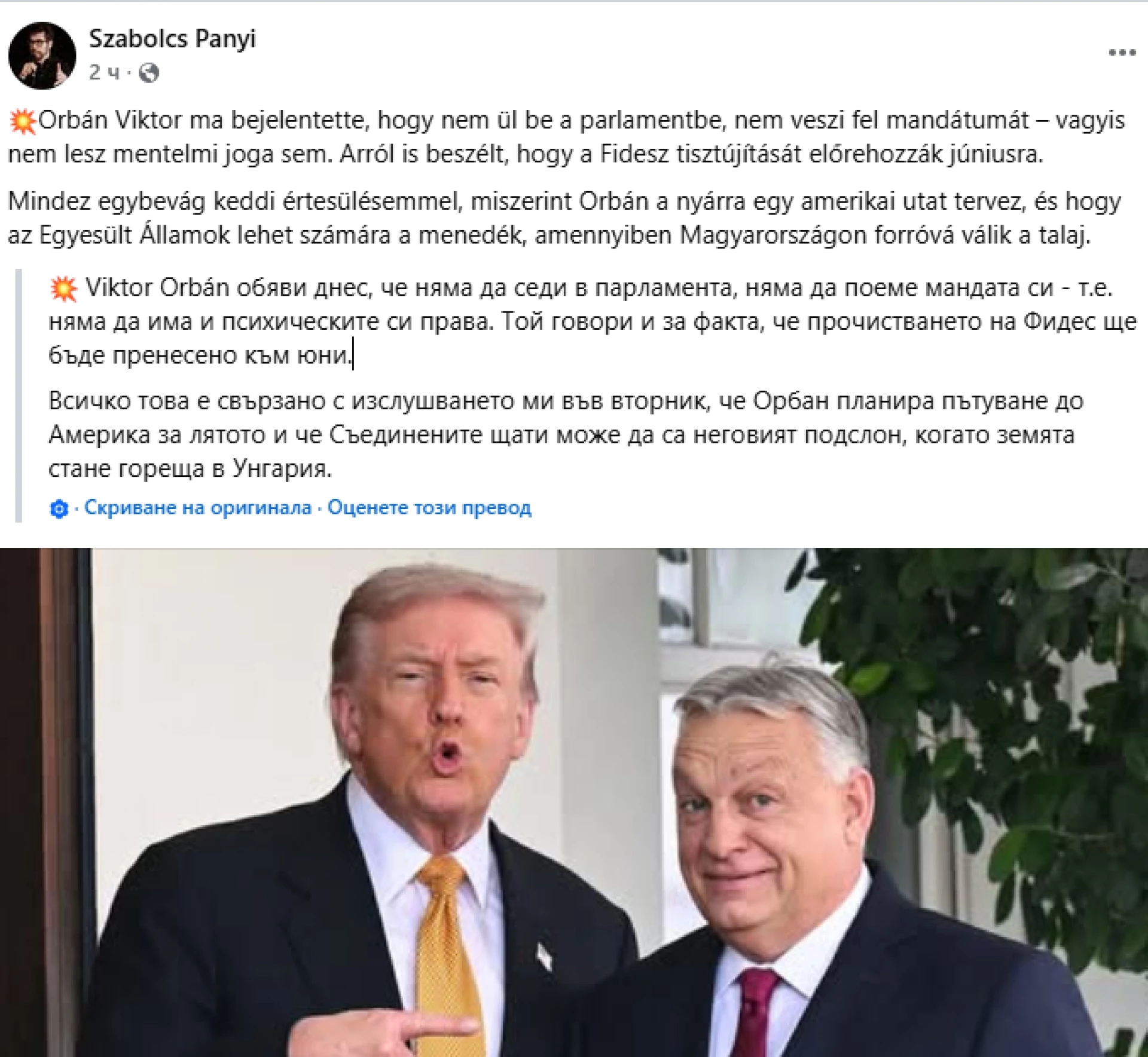 "Виктор Орбан обяви днес, че няма да заеме място в парламента и няма да приеме мандата – което означава, че няма да има и имунитет. Той също така отбеляза, че изборите за лидер на партията "Фидес" ще бъдат отложени за юни. Всичко това съвпада с информацията ми от вторник, според която Орбан планира пътуване до Съединените щати това лято и че Съединените щати биха могли да се превърнат в убежище за него, ако ситуацията в Унгария ескалира", пише журналистът.