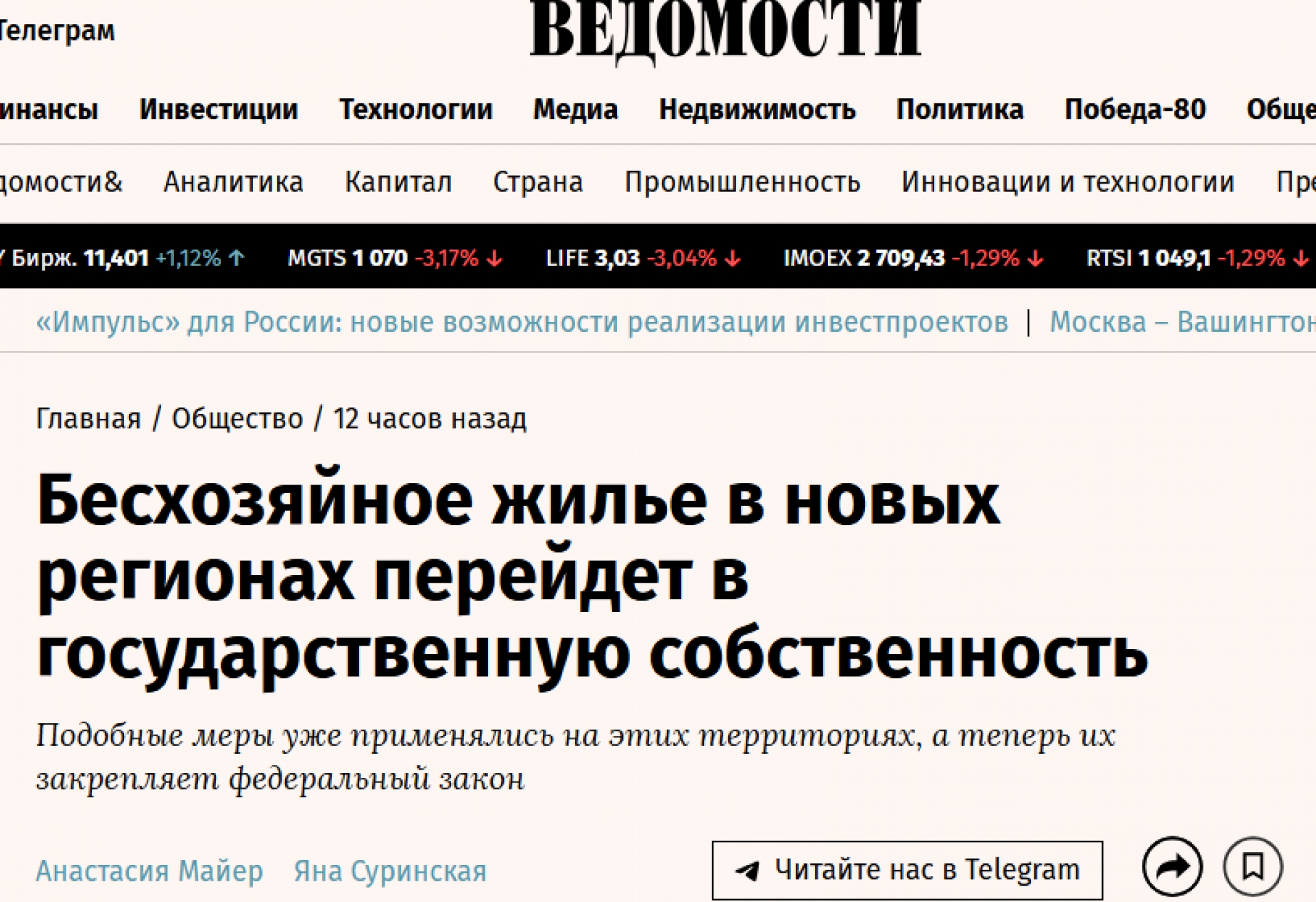 "Безстопанствените жилищни имоти" ще могат да бъдат прехвърляни на руски граждани, които постоянно пребивават "в територии, анексирани към Руската федерация" – тоест в окупираните територии на Украйна – и които са загубили домовете си поради военни действия или саботаж. Също така тези имоти ще могат да се разпределят като служебни за чиновници на държавни и общински агенции, военни, полицаи, учители, медицински работници, пише в законопроекта.
