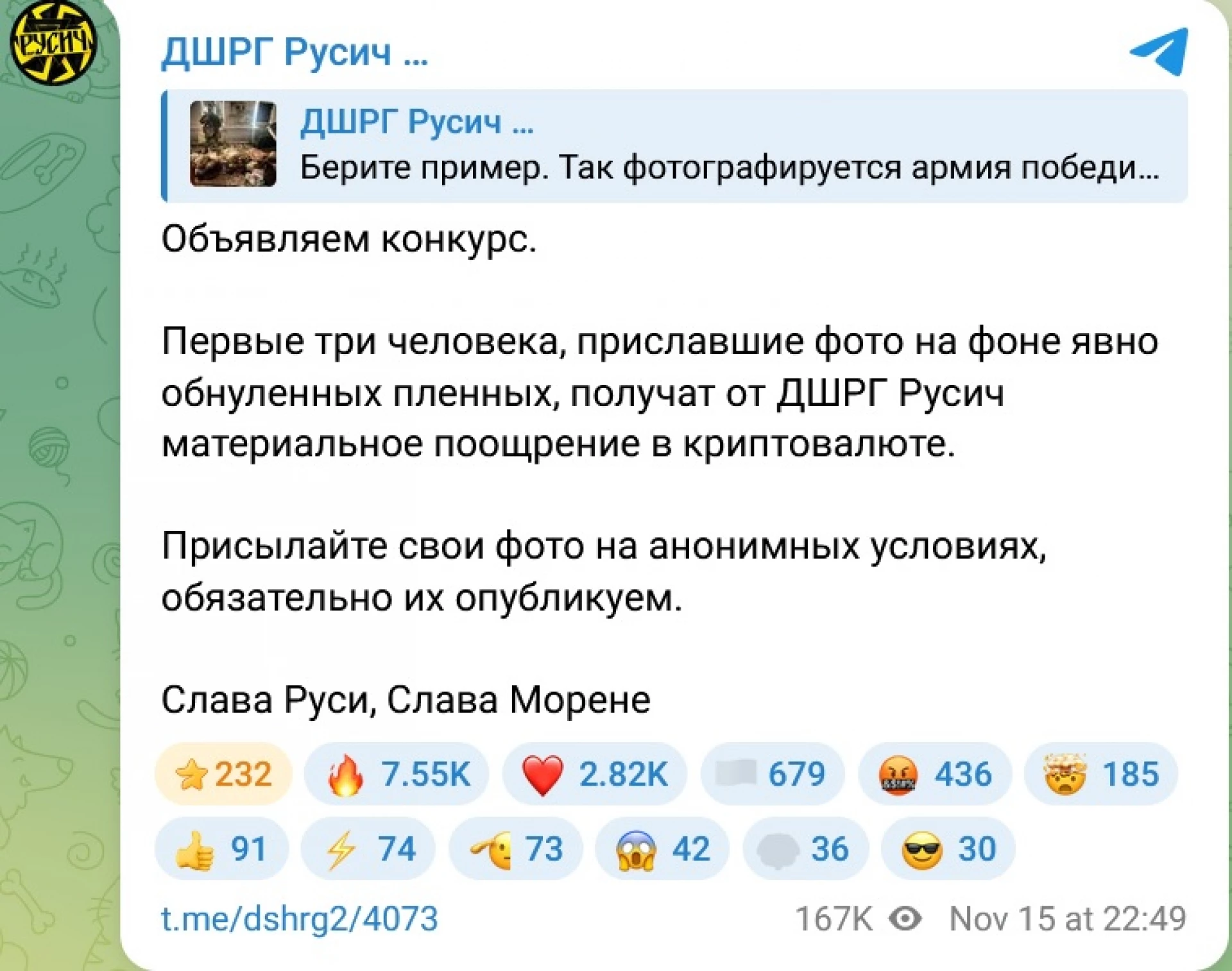"Обявяваме конкурс. Първите трима души, които изпратят снимка с ясно "занулени" затворници на заден план, ще получат награда в криптовалута от щурмовия полк "Русич". Изпратете снимките си анонимно и ние определено ще ги публикуваме", заявиха от "Русич" - руският опозиционен информационен канал ASTRA съобщи новината.