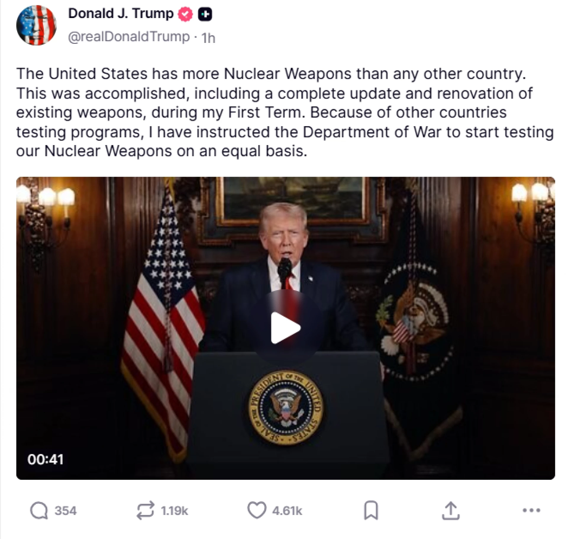 "Съединените щати имат повече ядрени оръжия от която и да е друга държава. Това беше постигнато, включително пълно обновяване на съществуващите оръжия, по време на първия ми мандат. Поради програмите за тестване на други държави, инструктирах Министерството на войната да започне да изпитва нашите ядрени оръжия на равна основа."