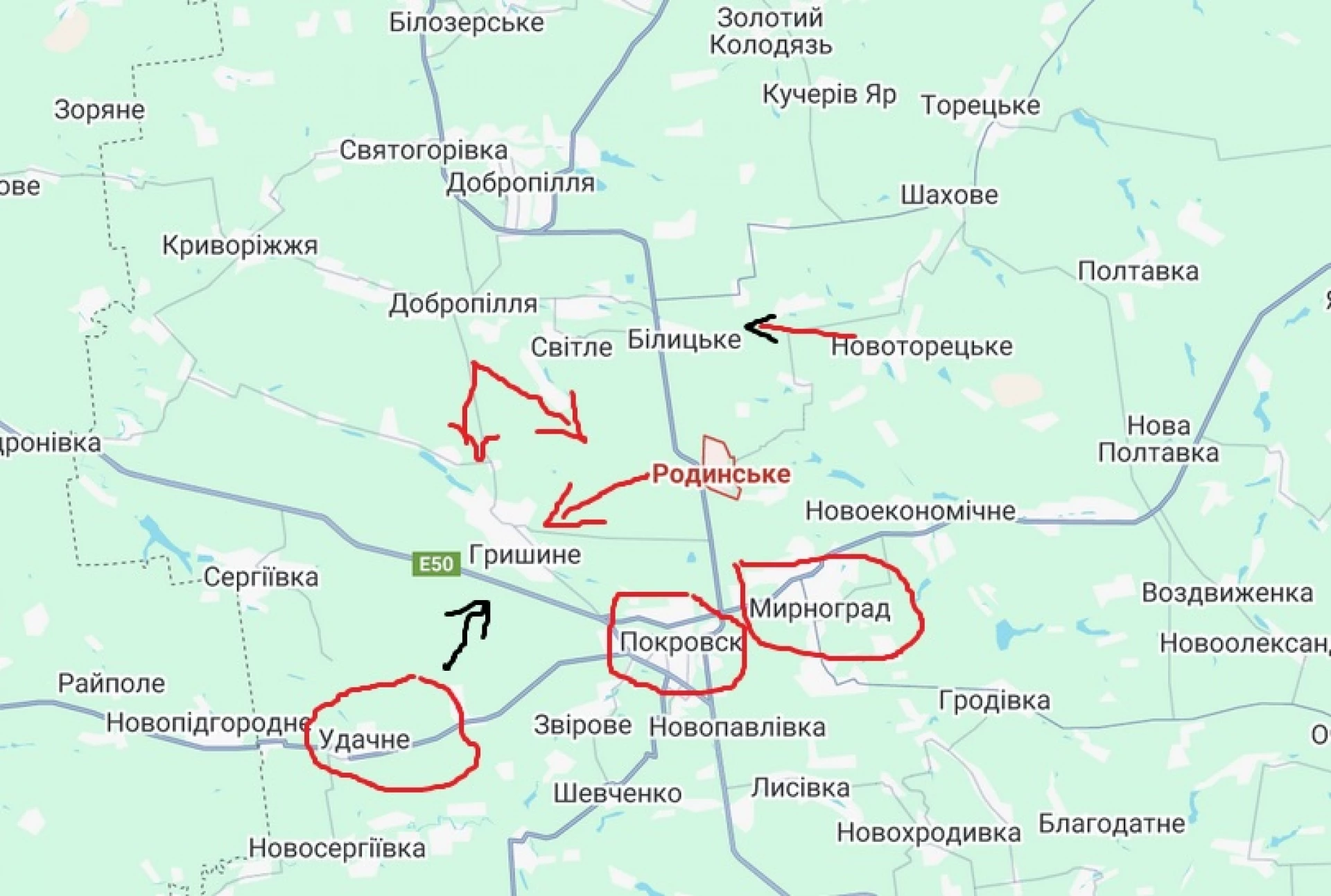 Машовец отчита, че руснаците въвеждат в боевете подкрепления, включително с бронирана техника. От север, 51-ва общовойскова руска армия "работи много упорито" да овладее участъка на пътя Т-0504 между Новоикономично и Мирноград, както и пътят между Гродовка и Мирноград от изток. Село Родинско, основната точка, от която ще се осъществи пълен контрол за обкръжение на Покровск, пак е сива зона – пак руснаците се мъчат да влязат и да се укрепят там, след като предишните им щурмови групи в рамките на селото бяха прочистени, добавя Машовец в анализа си. Според него, 51-ва армия контраатакува и в сектора северно от Покровск, към Добропиля, по линиите Никаноровка – Ивановка и Маяк – Ново Шахово, за да спрат продължаващото украинско настъпление, което заплашва флангово руските части, мъчещи се да овладеят Родинско. Има няколко малки руски щурмови групи в Ивановка и Ново Шахово, ще се опитат да оцелеят там следващите няколко дни, добавя о.з. полковникът. А за Мирноград твърди, че има руска позиция северно от града, че руска щурмова група е стигнала и село Ровно, но е била унищожена – редица руски Z-блогъри обявиха селото за руско владение. Руският военнопропаганден телеграм канал "Рибар", създаден и поддържан от бившия говорител на руското военно министерство капитан Михаил Звинчук, чете действията на 51-ва армия така: Проникнахме в полетата северно от Покровск, заплашвайки да обкръжим всички украински части в агломерацията Покровск – Мирноград. "Врагът се опитва да пробие нашата отбрана с контраатаки от север и да забави падането на Покровск и Мирноград", казват обаче колегите на "Рибар" от "Два майора".
