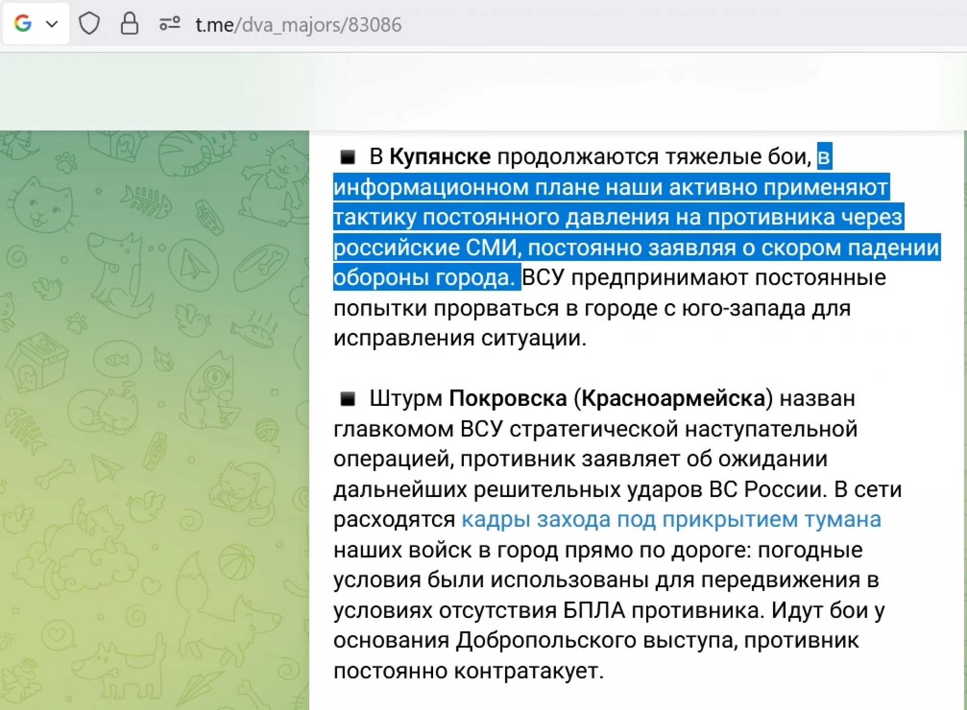"Нашите активно използват тактика на постоянен натиск върху противника чрез руските средства за масова информация, като постоянно обявяват предстоящия крах на отбраната на града". Това е дословен цитат от днешния сутрешен обзор на руския военнопропаганден телеграм канал "Два майора" и той се отнася за положението в Купянск.