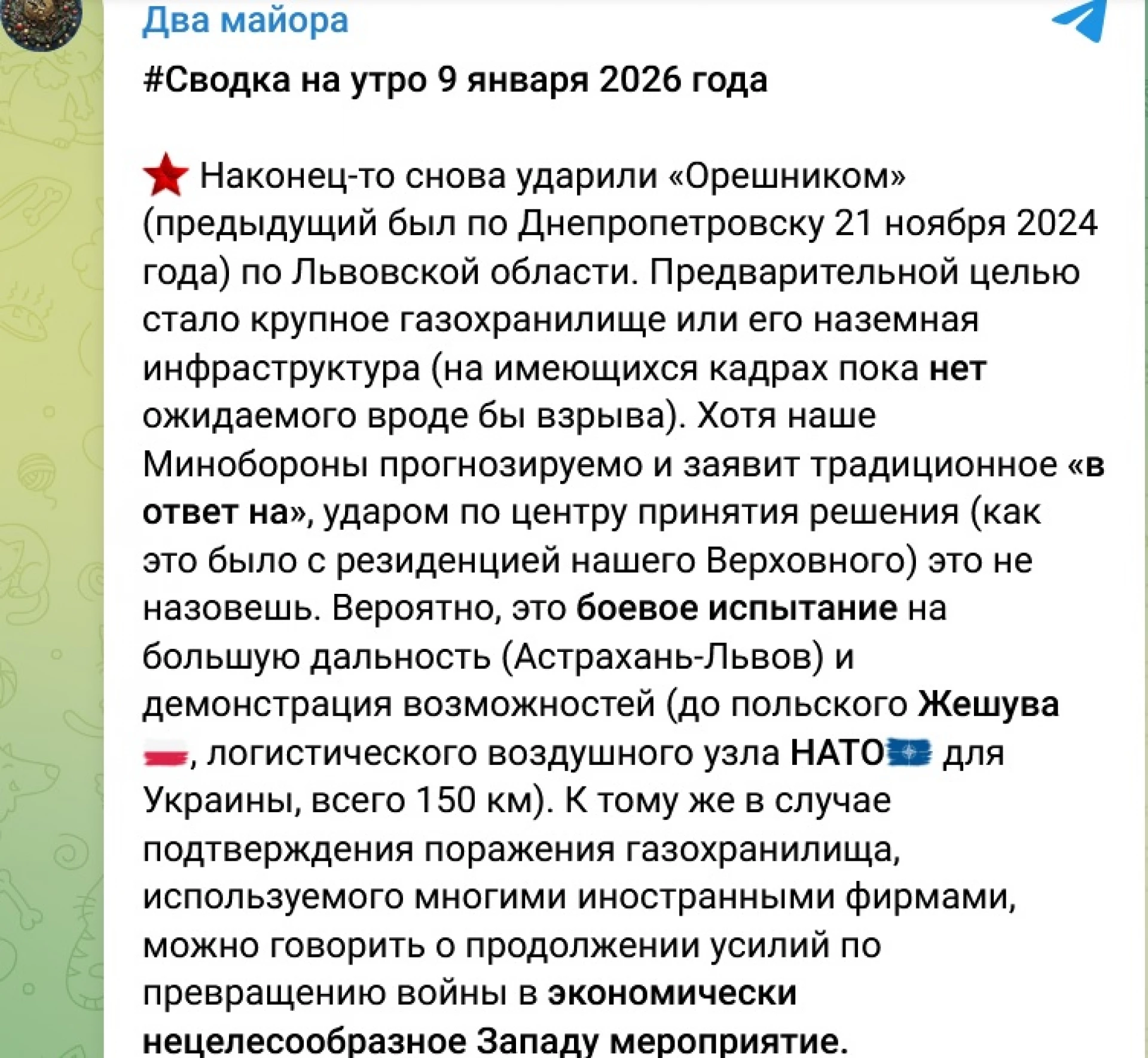 Руският военнопропаганден телеграм канал "Два майора" директно заявява в коментар за обстрела в сутрешния си обзор: "Предварителната цел беше голямо газово хранилище или неговата наземна инфраструктура (наличните кадри все още не показват очакваната експлозия)". Каналът недоволства, че това не било удар по "център за вземане на решения" в Украйна, както трябвало да е. И директно добавя, че вероятно става въпрос за ново изпитание на "Орешник", а не истински боен удар: