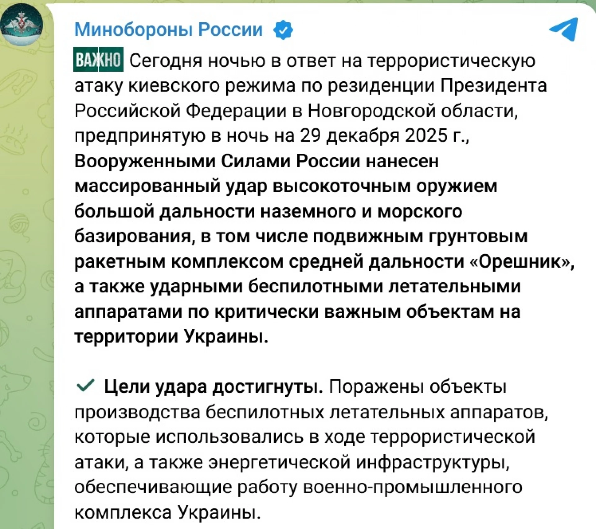 "Снощи, в отговор на терористичната атака на киевския режим срещу резиденцията на президента на Руската федерация в Новгородска област, която се случи в нощта на 29 декември 2025 г., руските въоръжени сили нанесоха масиран удар с високоточни оръжия с голям обсег от сухопътни и морски бази, включително мобилната наземна ракетна система със среден обсег "Орешник", както и удари с безпилотни летателни апарати, по критично важни цели на територията на Украйна. Целите на удара са постигнати. Целите включваха производствени съоръжения за безпилотните летателни апарати, използвани при терористичната атака, както и енергийна инфраструктура, поддържаща военно-промишления комплекс на Украйна". Това е официалното съобщение на руското военно министерство за поредната масирана руска комбинирана въздушна атака срещу Украйна – ОЩЕ: Русия удари Лвов: Има твърдения, че е използвана ракета "Орешник" (ВИДЕО)