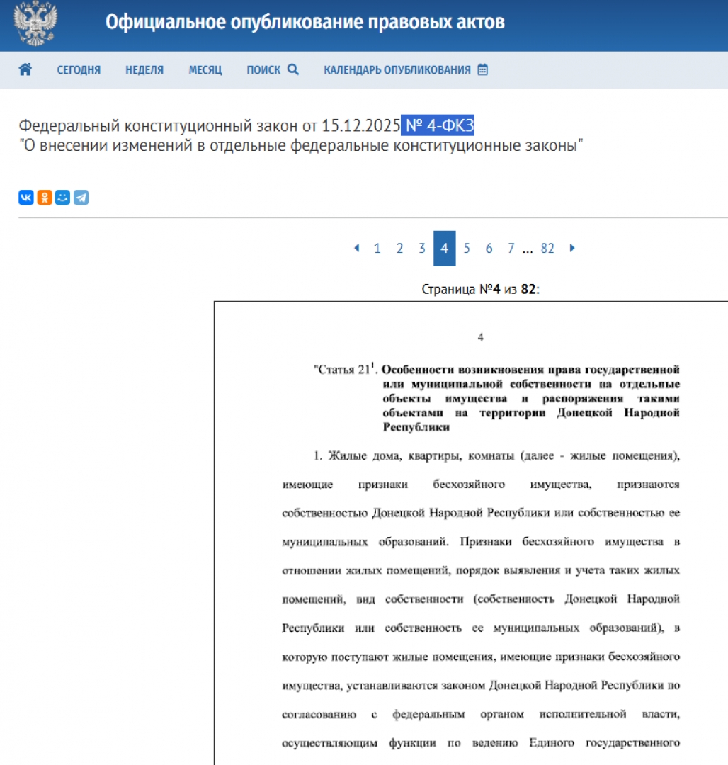 Окупационните власти в Донецка, Луганска, Херсонска и Запорожка области вече имат законното право да конфискуват жилищата на украинците, изоставени принудително докато хората са бягали от войната. На 15 декември руският диктатор Владимир Путин подписа федералния закон № 4-ФКЗ и той бе публикуван на държавния сайт, на който се обнародват правовите актове.