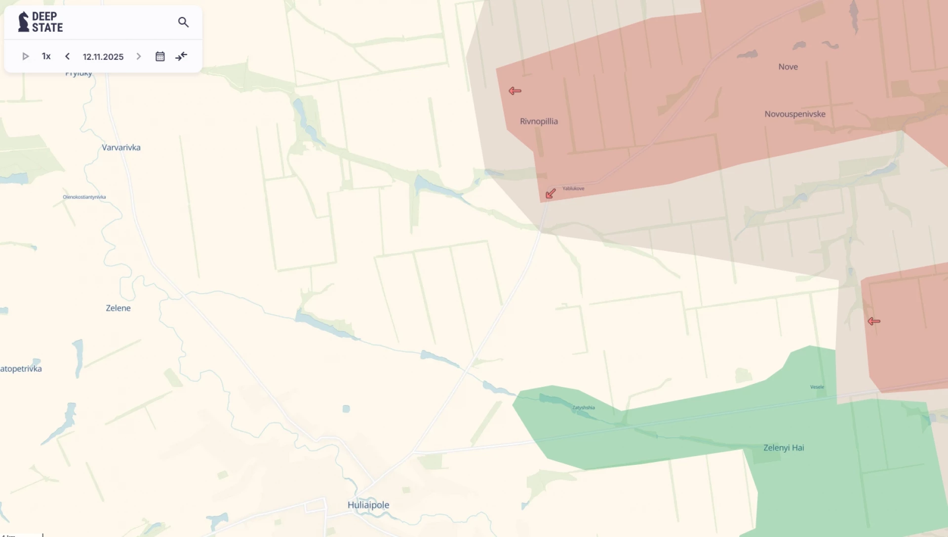 Ситуацията в посока Гуляйполе се влошава за ВСУ, въпреки че руските сили вероятно ще се нуждаят от значително време, за да създадат условия за превземане на селището, анализира американският мозъчен тръст Институт за изучаване на войната (ISW). Главнокомандващият украинските въоръжени сили генерал Олександър Сирски заяви на 12 ноември, че руските сили се възползват от лошите метеорологични условия, за да проникнат между украинските позиции и че са превзели три неуточнени населени места. Говорителят на украинските южни отбранителни сили полковник Владислав Волошин съобщи, че ВСУ са се оттеглили от позициите си близо до Новоуспеновско и Ново (и двете североизточно от Гуляйполе) и че продължават боевете за Ровнопиля, Яблуково и Солодко (всички североизточно от Гуляйполе). Южното оперативно командване на Украйна съобщи вчера, че руски удари с комбинирани оръжия са унищожили украински отбранителни позиции и са принудили украинските сили да се оттеглят от района на Ровнопиля на 11 ноември вечерта.