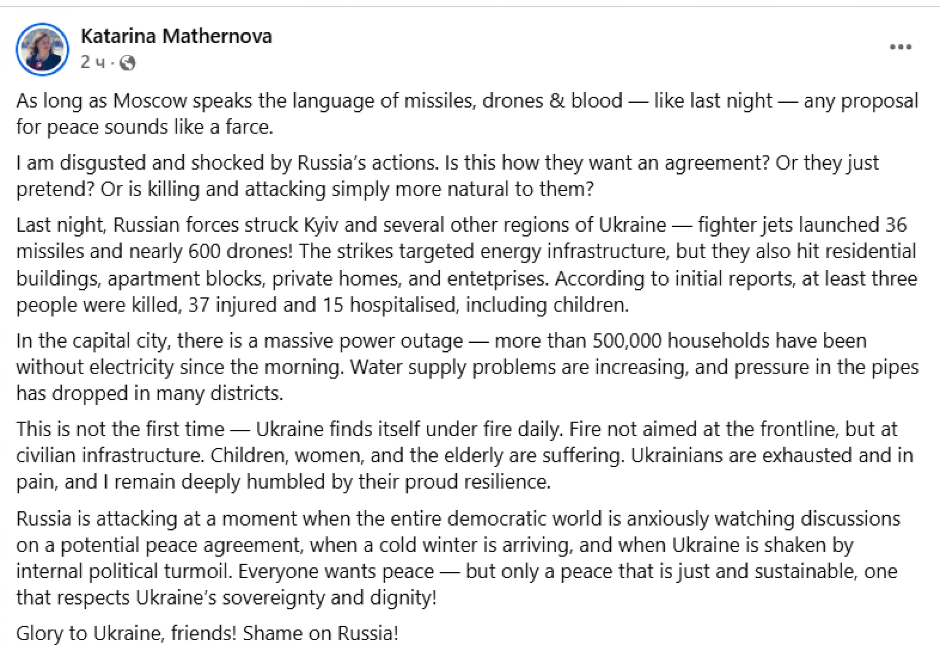 "Русия атакува в момент, когато целият демократичен свят следи с тревога дискусиите за евентуално мирно споразумение, когато наближава студената зима и когато Украйна е опустошена от вътрешнополитически вълнения. Всички искат мир – но само справедлив и устойчив мир, който зачита суверенитета и достойнството на Украйна", пише Матернова.