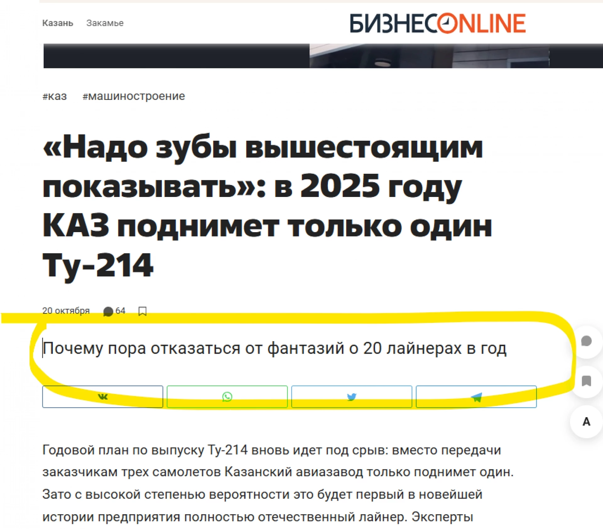 Годишният план за производство на самолетите Ту-214 в Русия е пропаднал. Вместо планираните за тази година три самолета за гражданската авиация Казанският самолетен завод, дъщерно дружество на "Туполев", ще произведе само един. Това ще бъде "може би" първият изцяло произведен в страната пътнически самолет в най-новата история на завода, пише бизнес изданието на Газета.ру. И добавя - време е да се откажем от фантазиите за 20 пътнически самолета годишно.