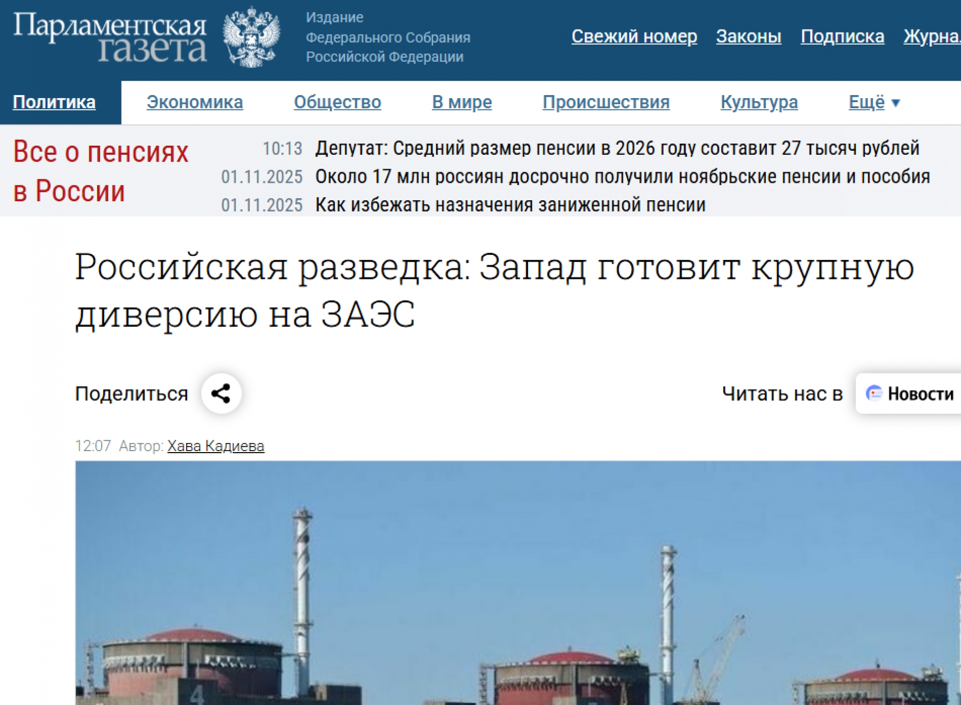 Руската Служба за външно разузнаване (СВР) заяви, че Западът подготвя саботаж на най-голямата в Европа ядрена електроцентрала - Запорожката, която е окупирана от Русия от 2022 г. - и смятат да обвинят за това Москва. Съобщението се появи на сайта на СВР. Информацията се разпространява днес от руските медии, начело с "Парламентская газета" - официалното издание на Съвета на Руската федерация, в което се публикуват приетите федерални закони и други нормативни актове.