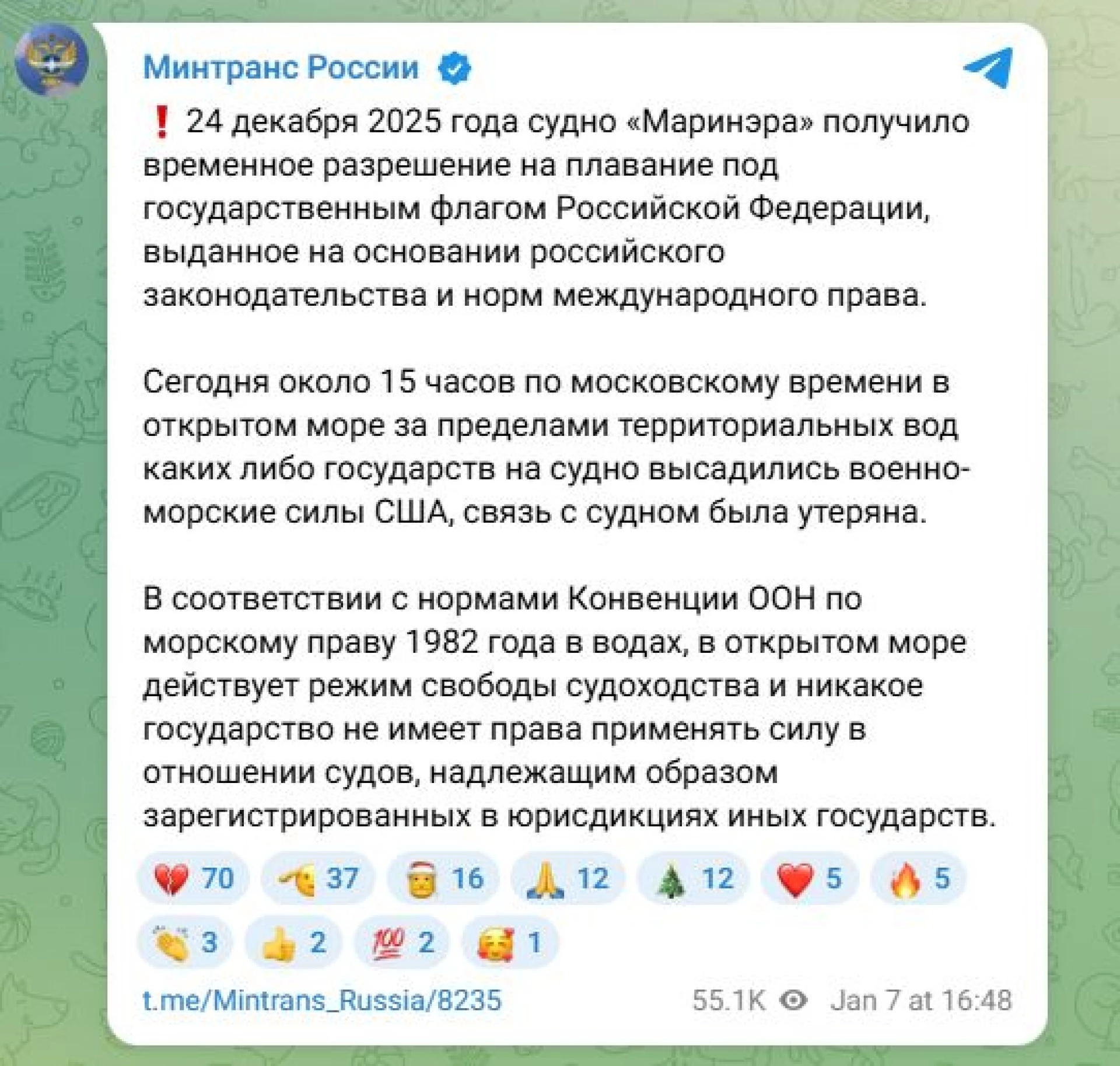 От руското Министерство на транспорта пишат, че САЩ не могат да използват сила срещу кораби, "надлежно регистрирани в юрисдикцията на други държави", което е отбелязано "в Конвенцията на ООН по морско право от 1982 г.".