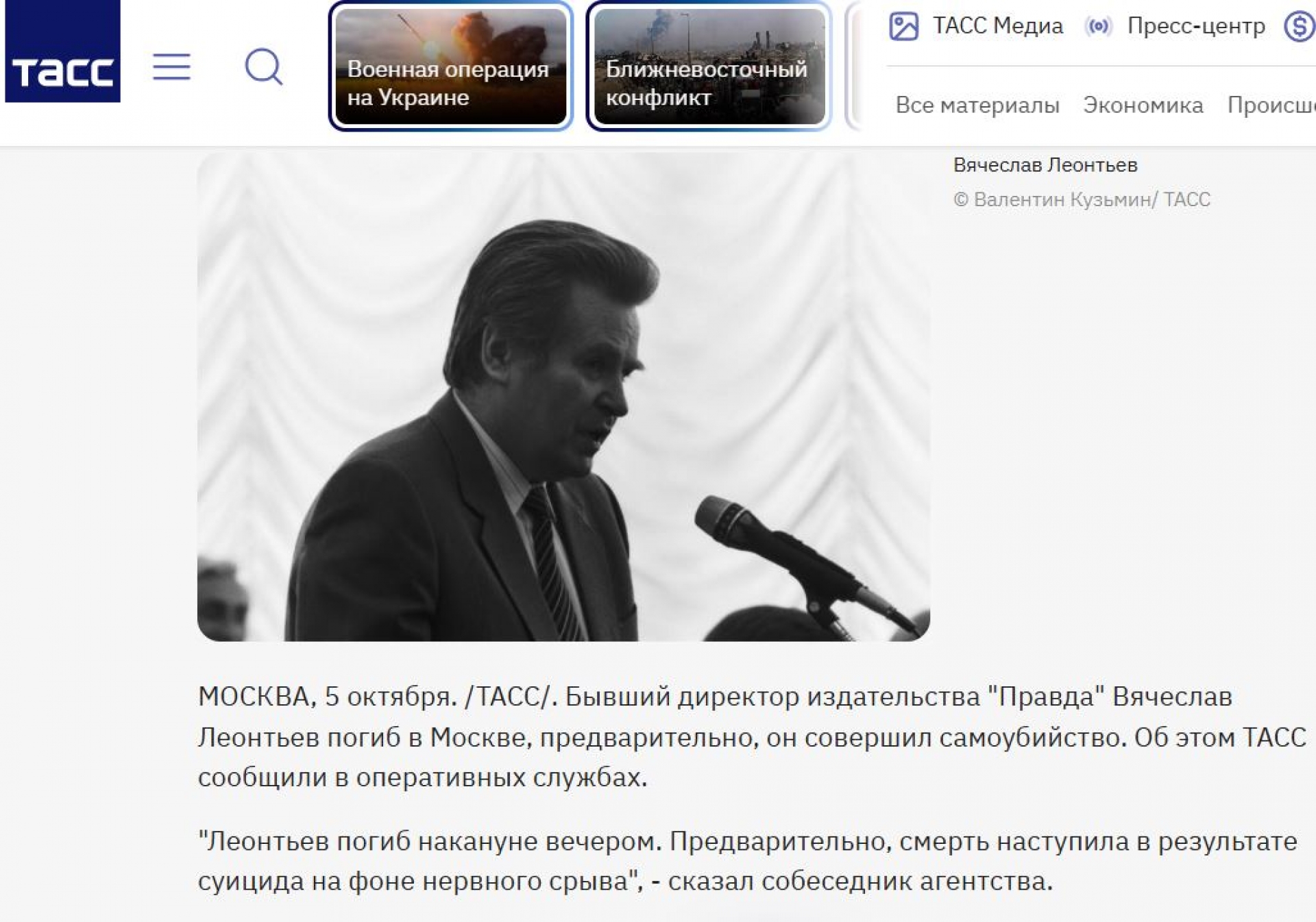 Бившият ръководител на издателство "Преса" (бившата "Правда") Вячеслав Леонтиев е бил намерен мъртъв край дома си в Москва на 4 октомври. Предварителните доклади на полицейските органи сочат, че смъртта е настъпила поради "самоубийство заради нервен срив", съобщава ТАСС, позовавайки се на източник, като се смята, че той е скочил от прозореца на апартамента си. По трупа на 87-годишния Леонтиев не са открити криминални следи от насилствени действия.