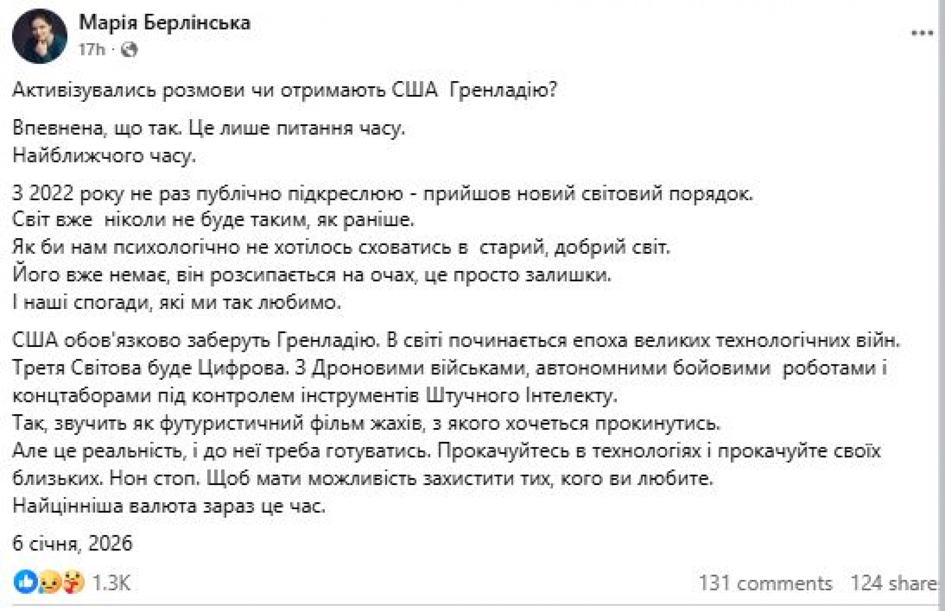 Третата световна война е на прага и на практика е неизбежна. Това ще бъде дигитална война, която ще се води с дронове и бойни роботи, и в нея ще има концентрационни лагери, в които наблюдението ще се извършва от изкуствен интелект. Това пише известната украинска доброволка и военнослужеща Мария Берлинска, директор на "Центъра за подкрепа на въздушното разузнаване", който организира курсове за управление на военни дронове още от 2015 г., както и основател на "Невидимия батальон" - организация за правата на украинските военни във войната с Русия (от 2014 г.), правата на жените в украинската армия, рехабилитацията на ветерани от руско-украинската война и борбата срещу сексуалното насилие във Въоръжените сили на Украйна.