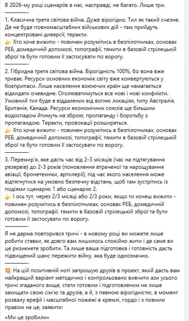 "Ресурсите на големите икономики в света вече се превръщат в боеприпаси. Само че населението на воюващите страни все още се опитва да отхвърли очевидното. Ще се появят все повече места на конфликти. Условният тил ще бъде на места, отдалечени от огъня, като Австралия, Великобритания, Канада. Ресурсите на икономическите съюзи ще бъдат вложени още повече в оръжия, пропаганда и борба с пропагандата. Терористичните атаки и провокации ще се увеличат."