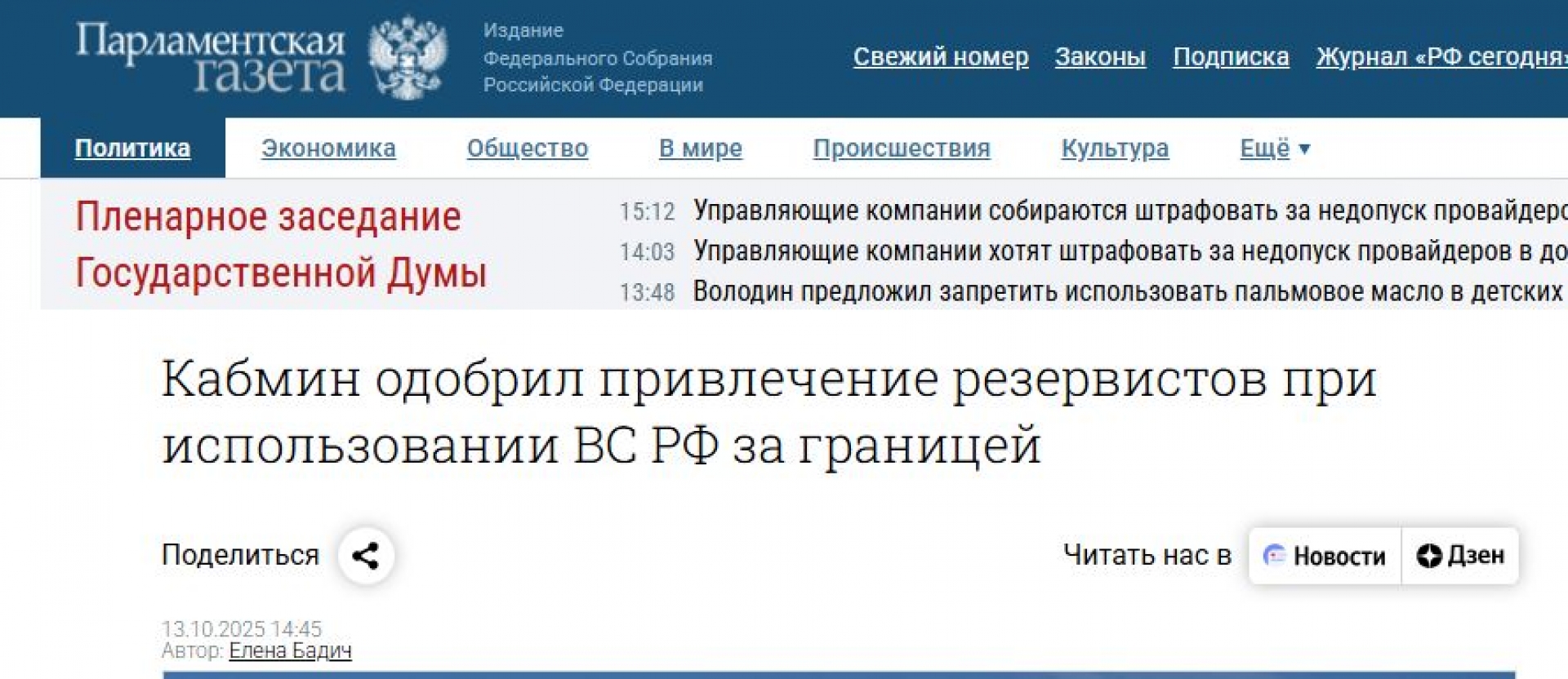 Русия одобри законопроект, позволяващ граждани от мобилизационния резерв да бъдат призовавани и изпращани на бойни мисии извън руска територия, дори в мирно време. Така резервисти ще могат да бъдат включвани в т.нар. контратерористични операции на руската армия в чужбина - такава се води и "специалната военна операция", т.е. войната в Украйна. Съобщението, че правителствена комисия е одобрила законопроекта се появи на сайта на контролираната ог Кремъл ТАСС, която цитира материали от заседанието на комисията.
