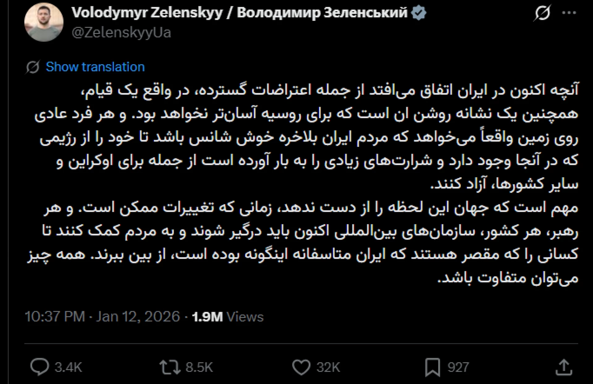 Много е важно да не бъде пропуснат моментът сега, в който е възможно ситуацията в Иран да бъде променена и светът да помогне на иранския народ. Това написа украинският президент Володимир Зеленски, при това за първи път на фарси, в профила си в Х: