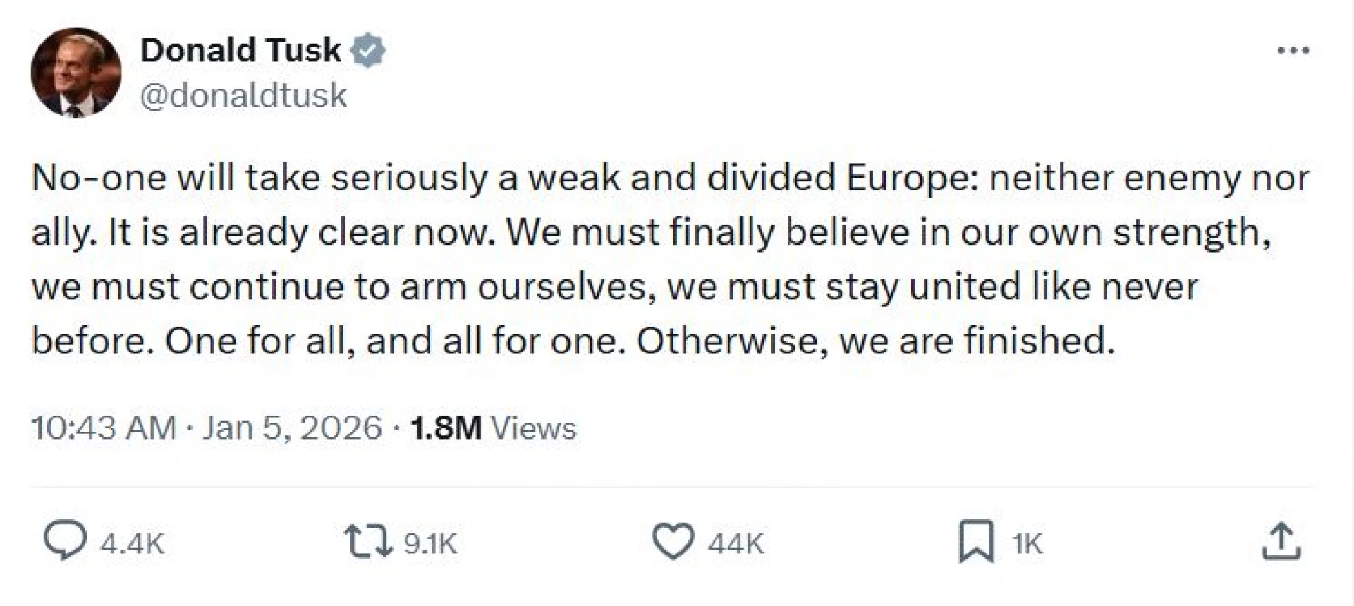 "Никой няма да приема сериозно слаба и разделена Европа: нито враг, нито съюзник. Това вече е ясно. (...) Един за всички и всички за един. В противен случай това ще е краят ни", написа Туск в социалната мрежа Х.