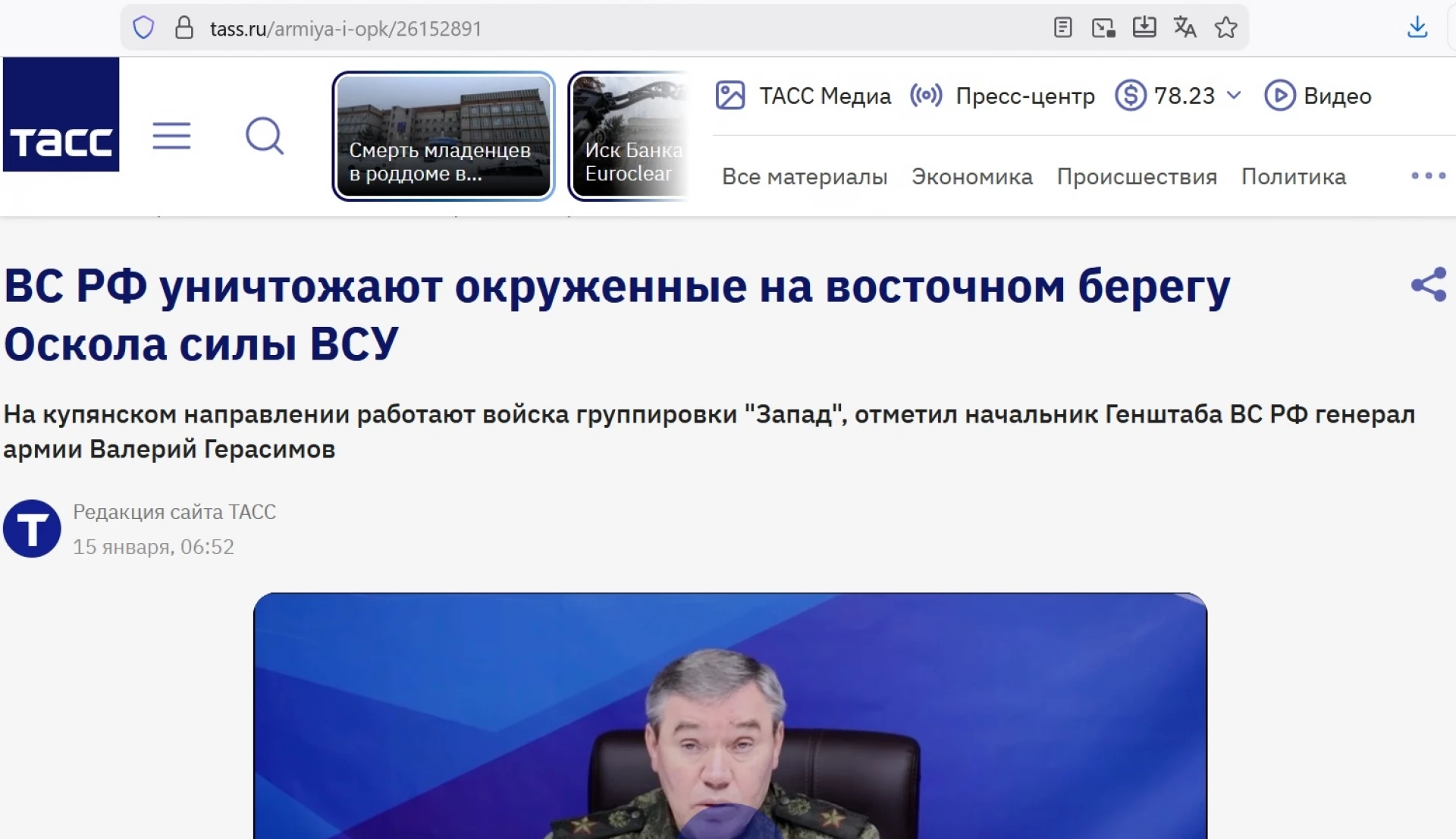 "Групировката войски "Запад" продължава да елиминира украински формирования на източния бряг на река Оскол в Купянското направление. Това обяви началникът на руския генщаб генерал от армията Валерий Герасимов. "В Купянското направление частите на групировката войски "Запад" продължават да елиминират формирования на украинските въоръжени сили, обкръжени на източния бряг на река Оскол", каза той. И това е дословен цитат от руската държавна пропагандно-информационна агенция ТАСС.